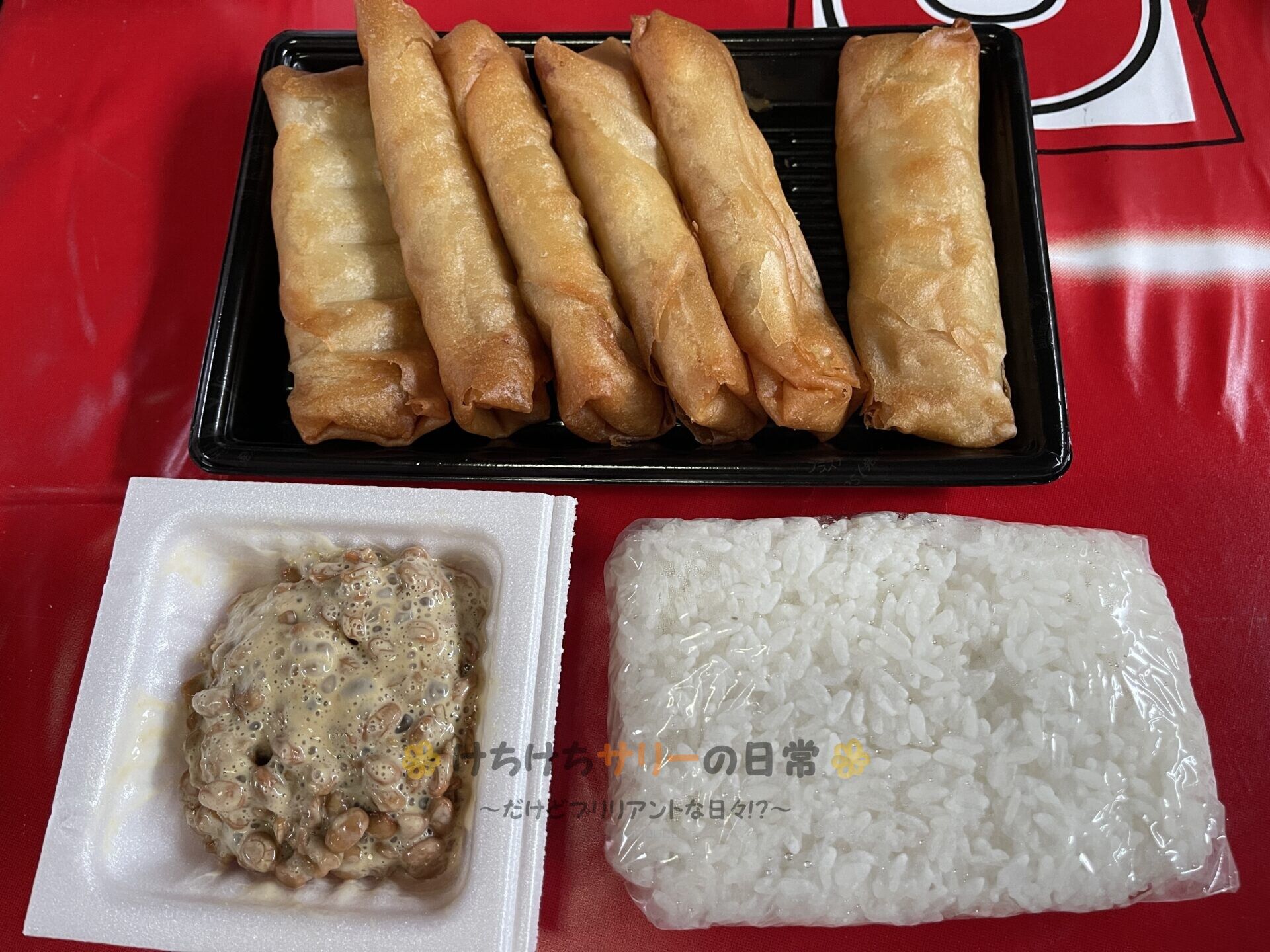 この日の昼ご飯は「冷凍ご飯」、「納豆」、「春巻き」。
