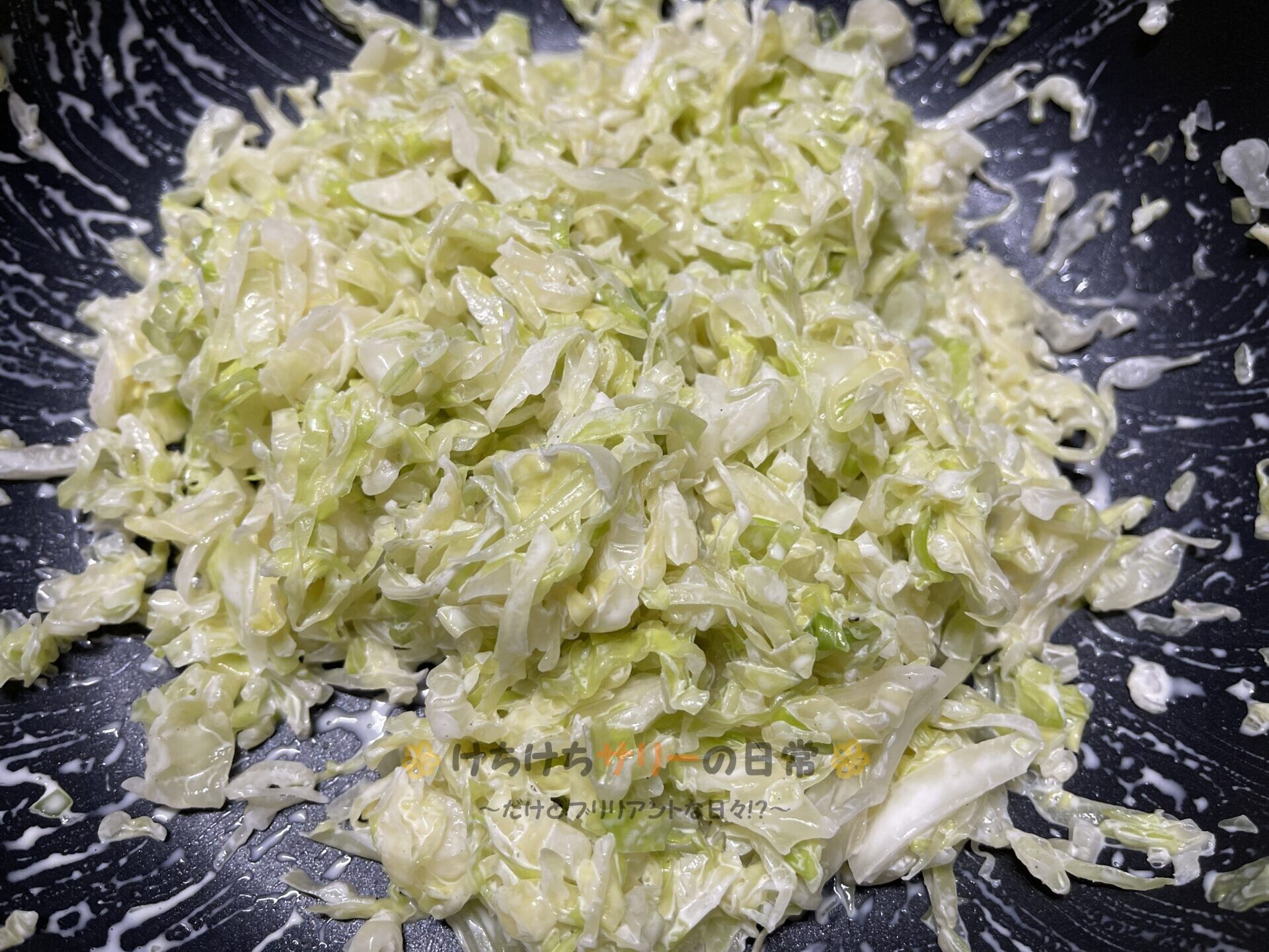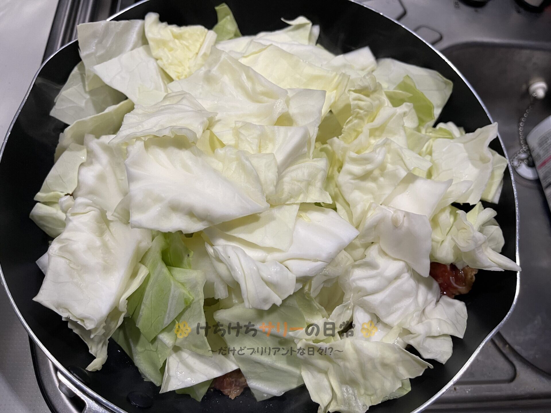 肉の色が変わったら、ざく切りにしたキャベツをたっぷり投入!