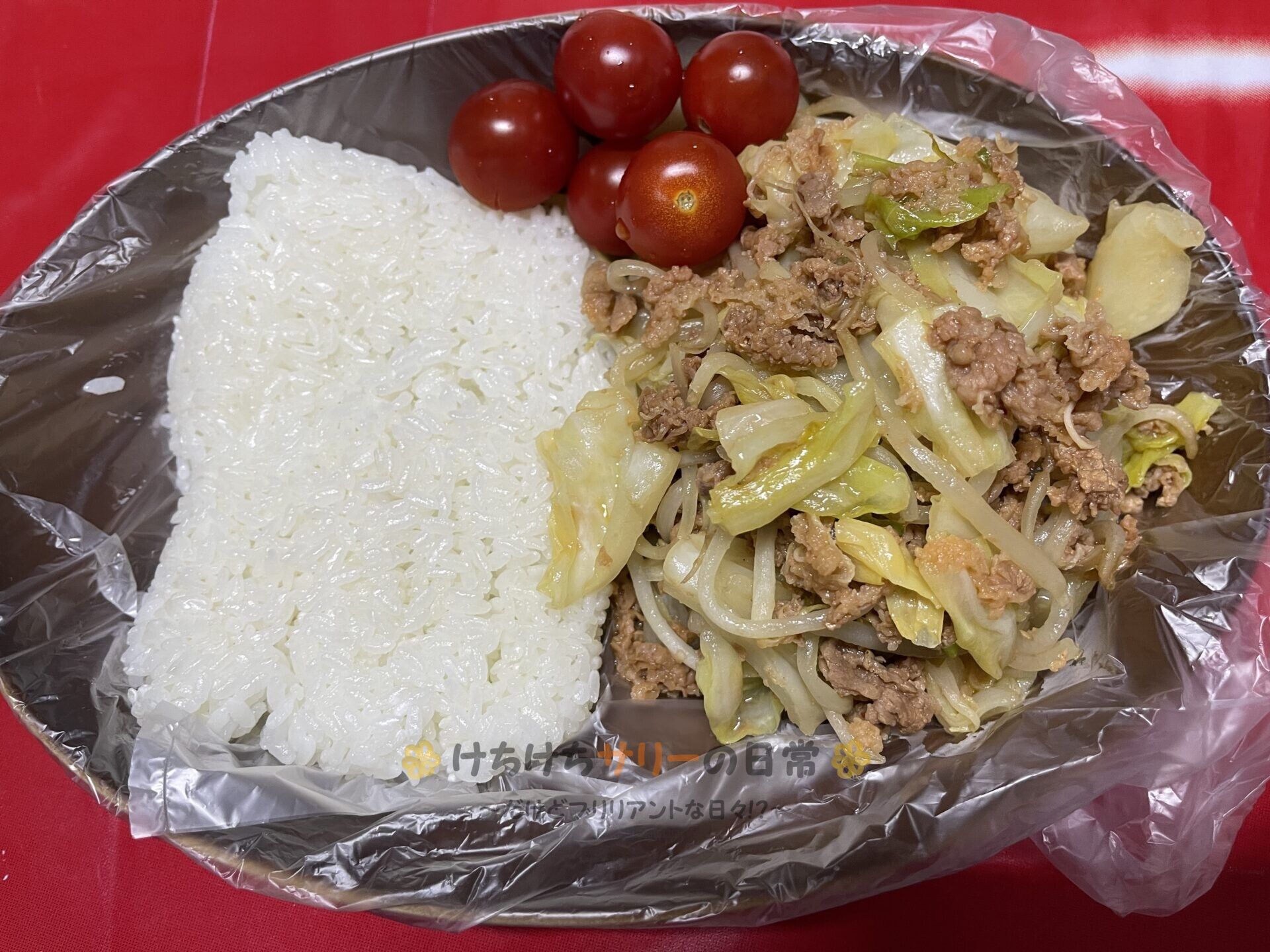 この日の夕ご飯は「冷凍ご飯」、「プルコギ肉とキャベツ・もやしの炒め物」、「ミニトマト」だよ。
