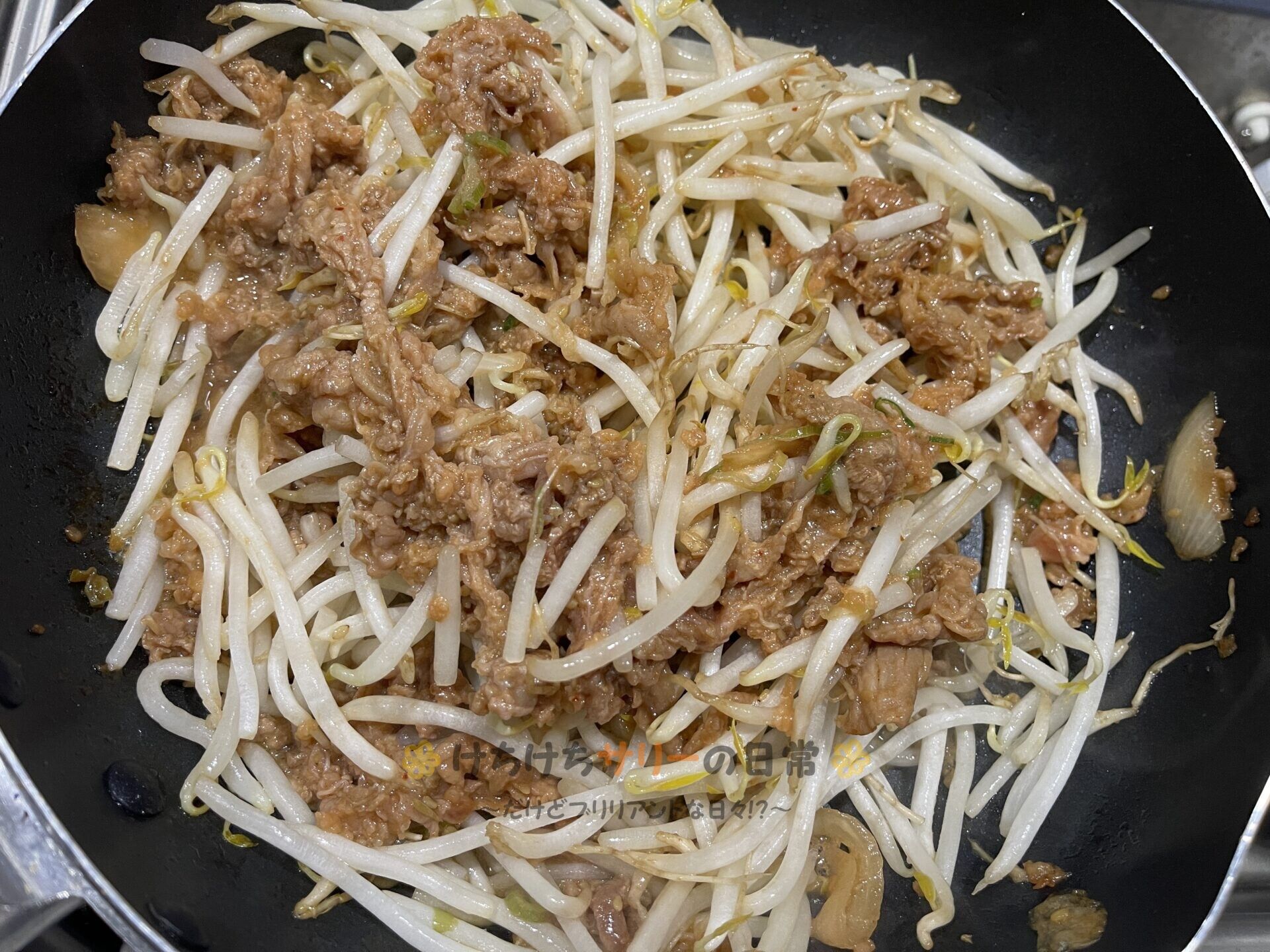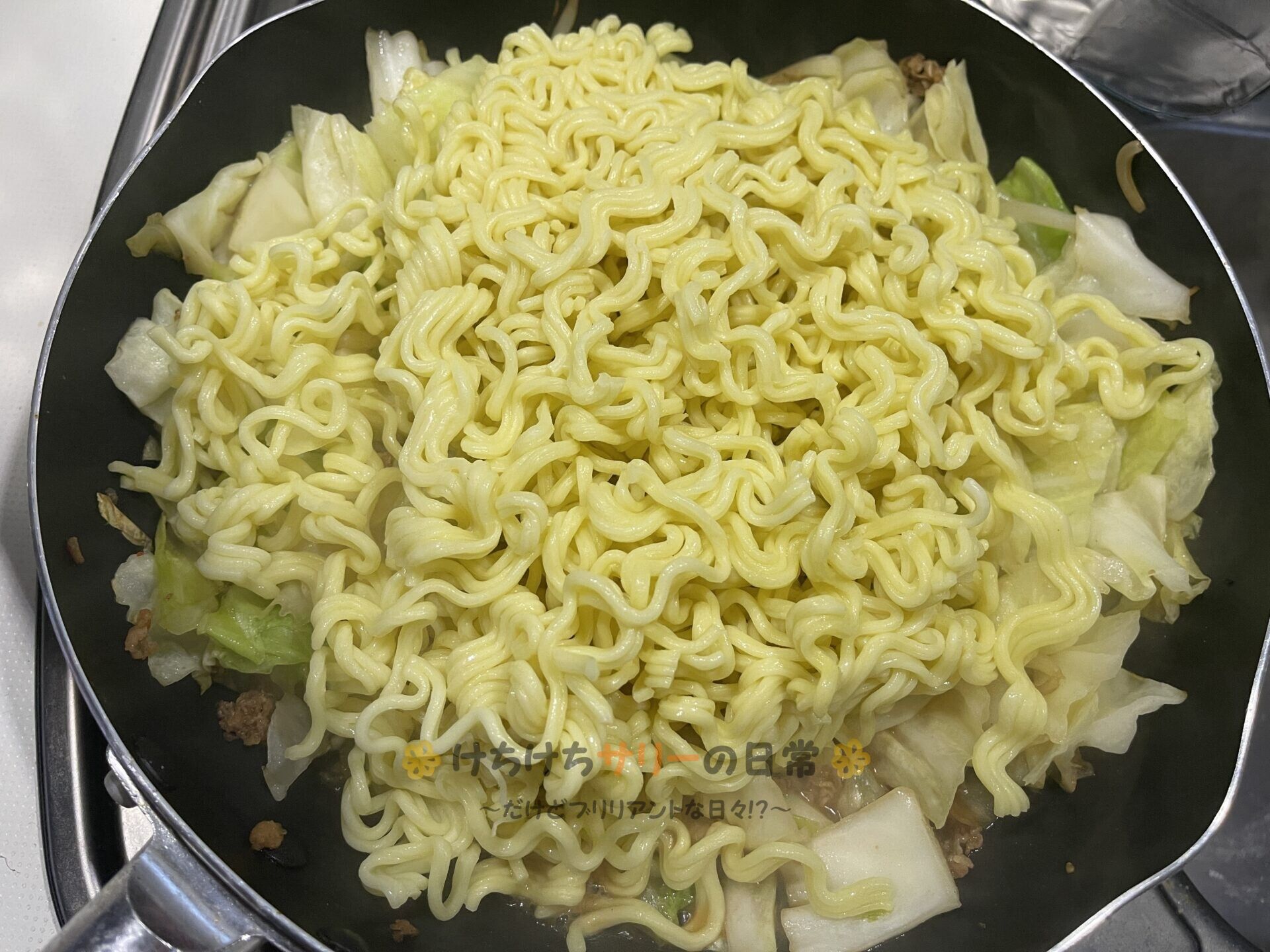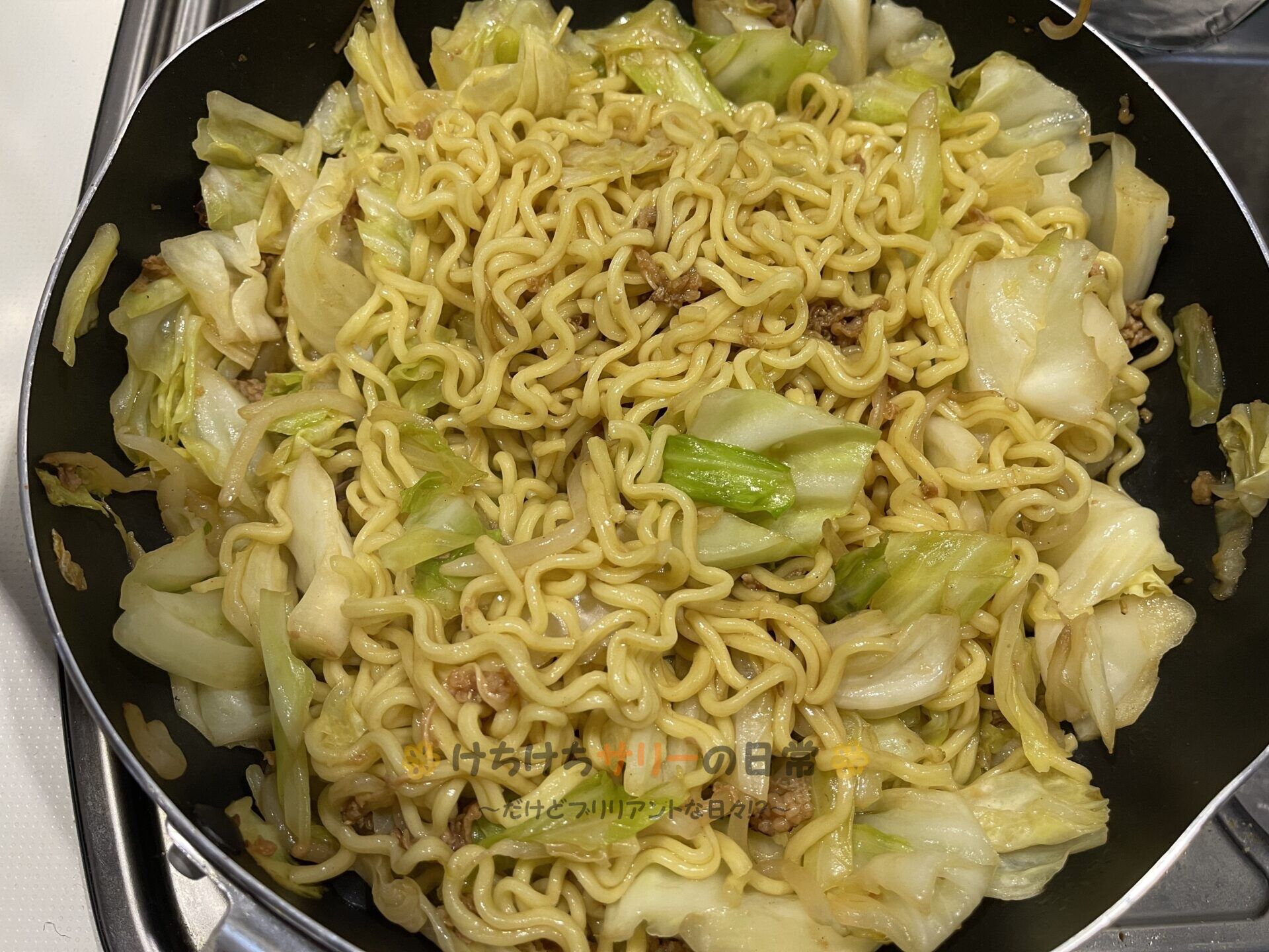 麺がほぐれて温まったらソースを加えて、更に炒めたらお昼ご飯の完成✨
