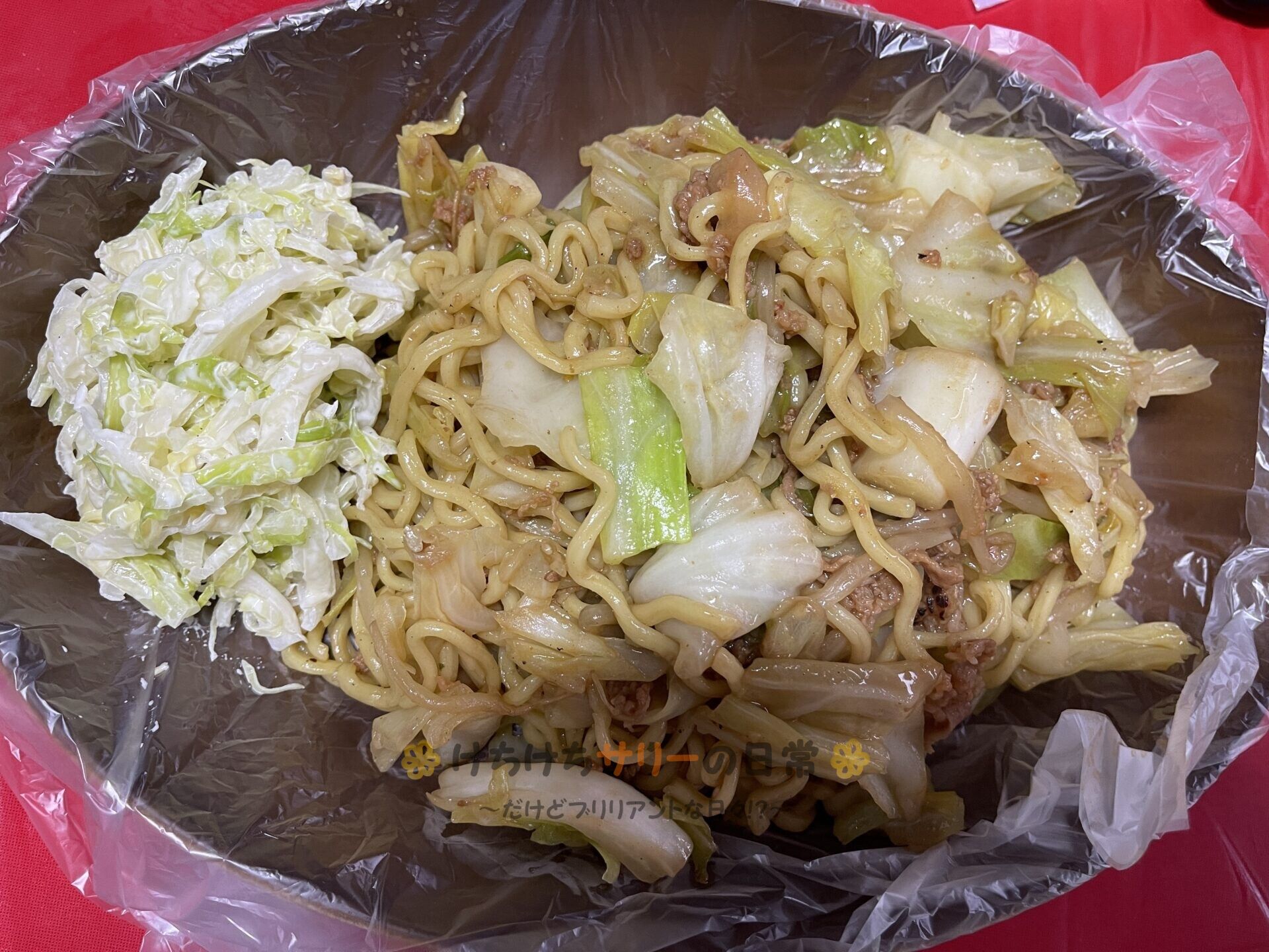 この日のお昼ご飯は「焼きそば」、「コールスローサラダ」だよ。