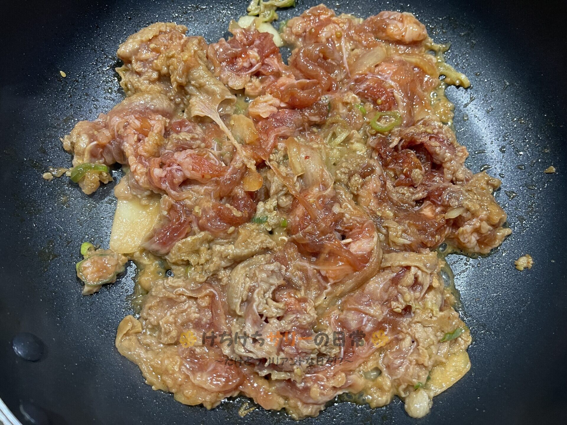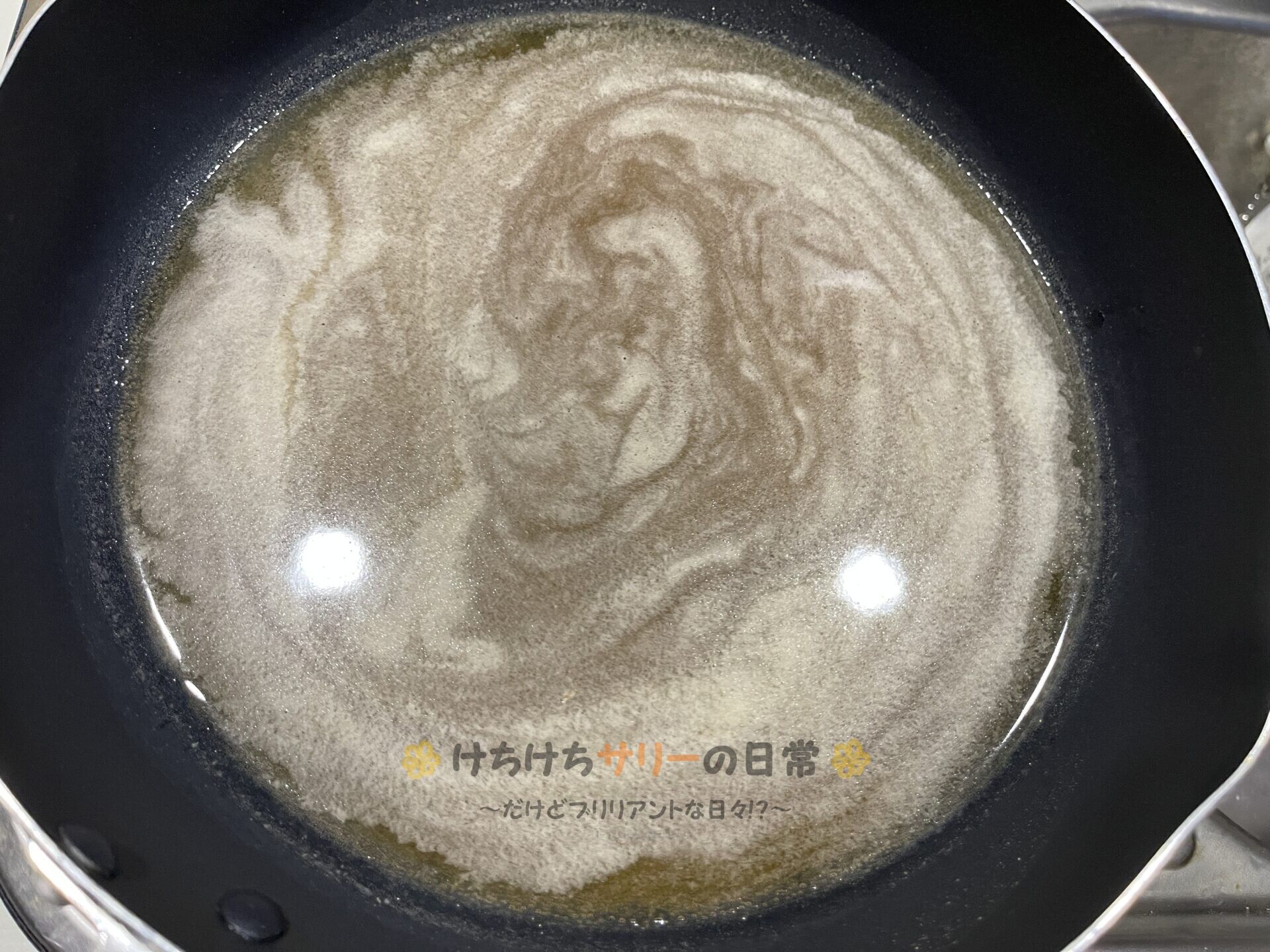切り干し大根の戻し汁スープを楽しみながら、フライパンに酒、醤油、みりん、砂糖、粉末だしを入れて温める。