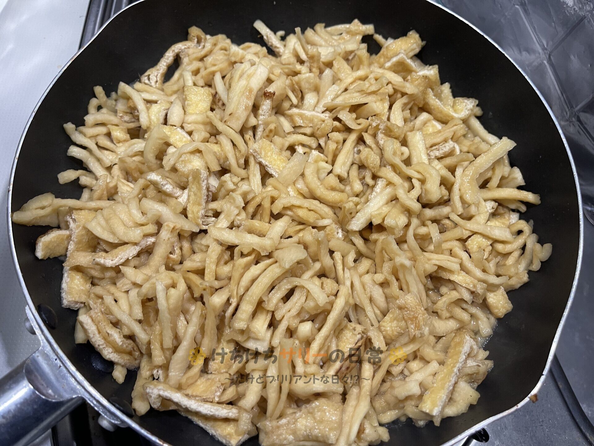 煮た後は冷ましておいた方が味がしみるので、放置。 フライパンいっぱいの切り干し大根と油揚げの煮物ができたよ😁