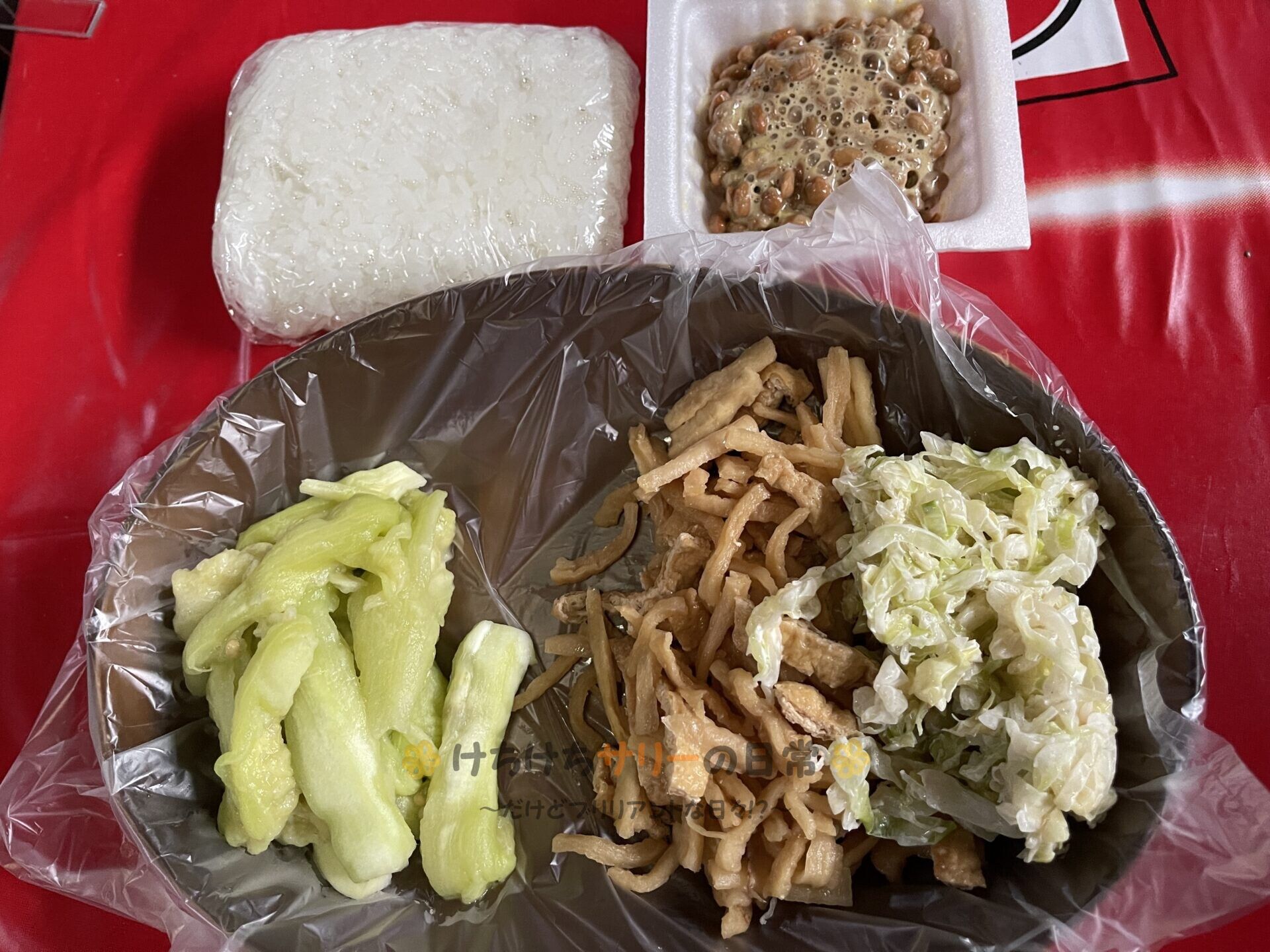 この日の昼ご飯は「冷凍ご飯」、「納豆」、「茄子のレンジ蒸し」、「切り干し大根と油揚げの煮物」、「コールスローサラダ」だよ。