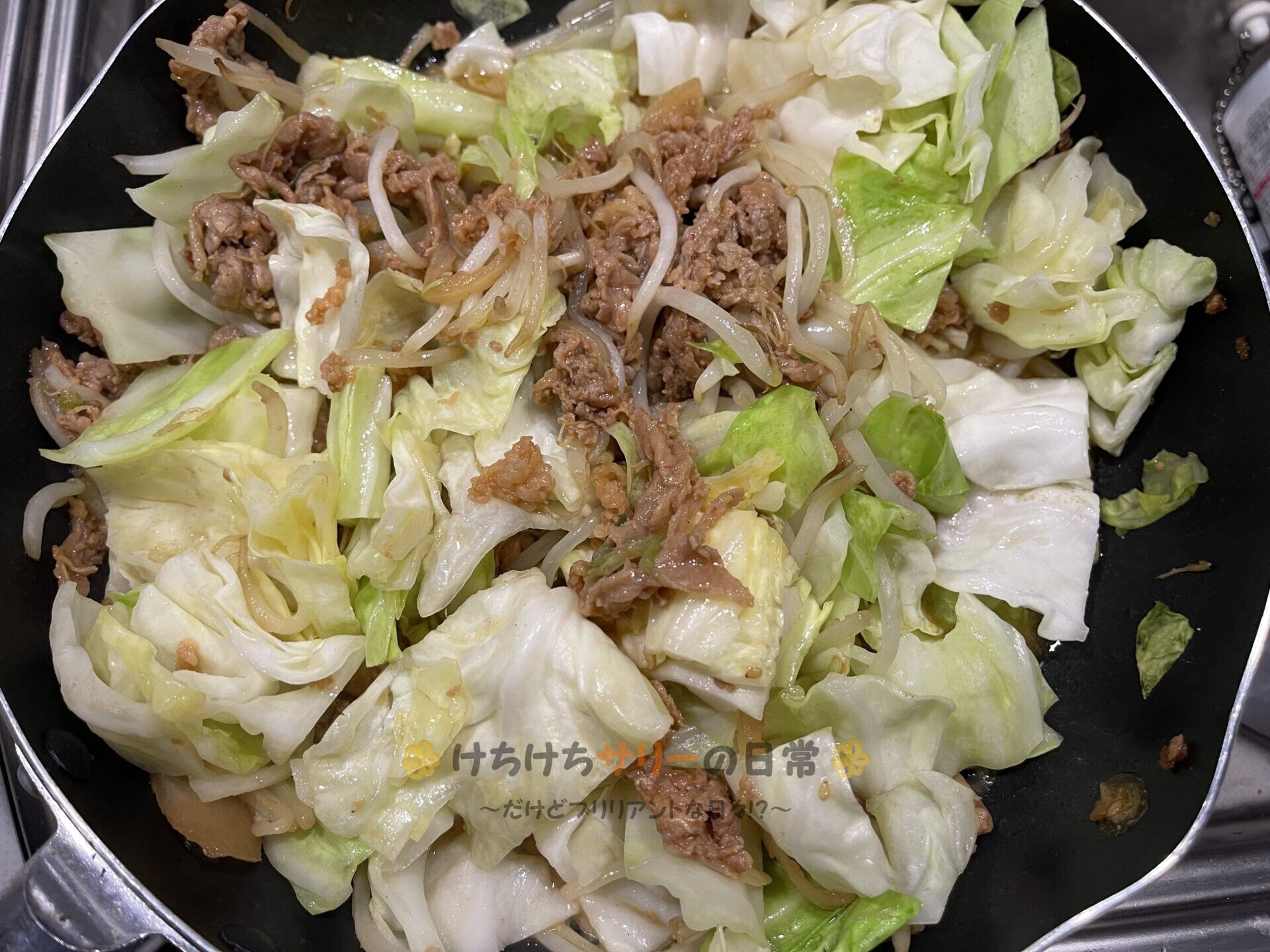 フライパンを出して前の日、ざく切りに切っておいたキャベツを塩コショウして炒める。