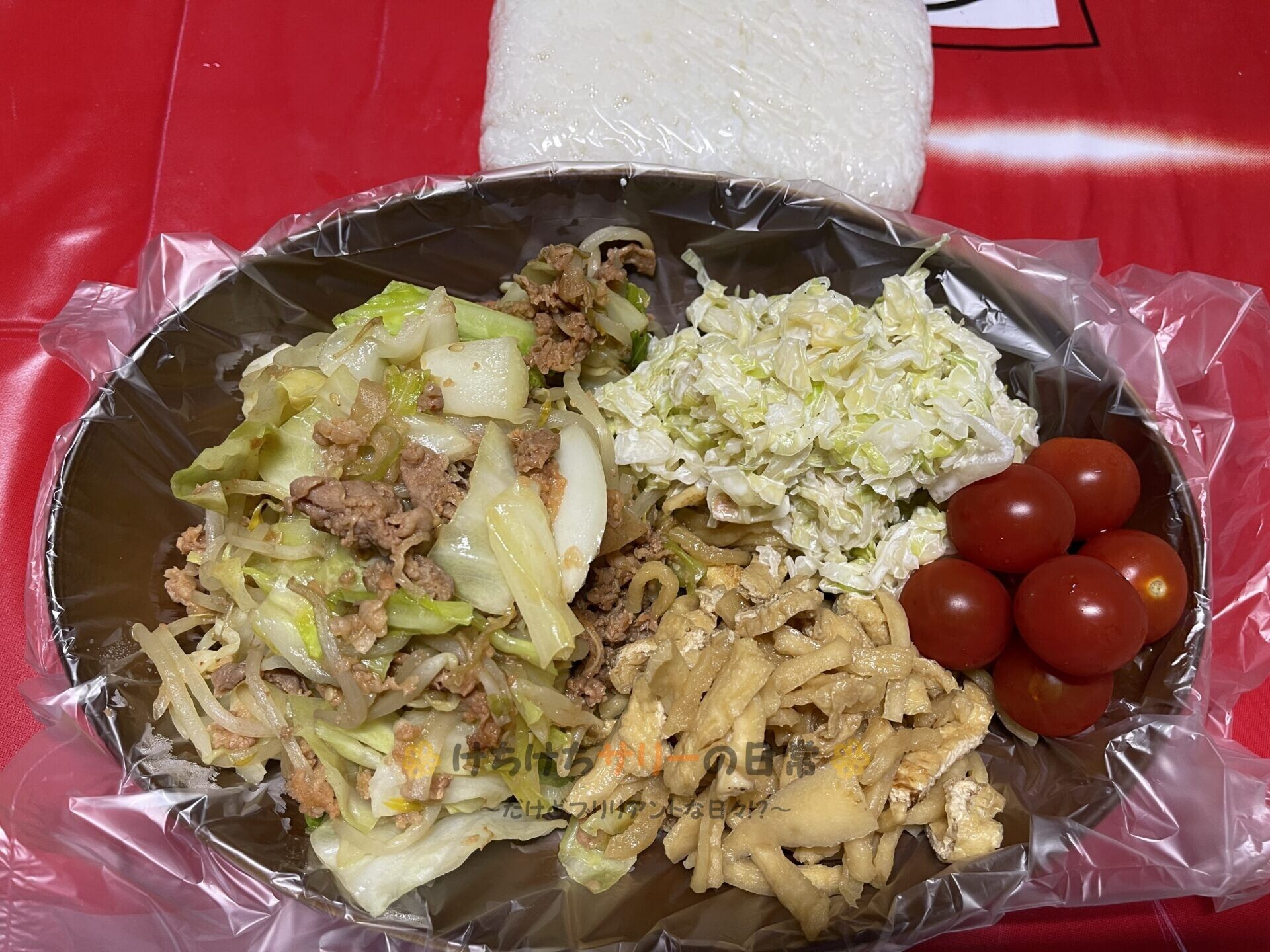 この日の夕ご飯は「冷凍ご飯」、「プルコギ肉ともやしキャベツ炒め」、「切り干し大根と油揚げの煮物」、「コールスローサラダ」、「ミニトマト」だよ。