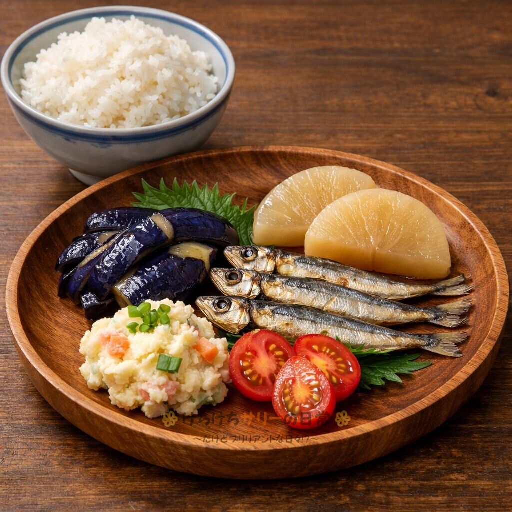 夕ご飯は 「ご飯」、「メザシ」、「大根の煮物」、「ポテトサラダwithミニトマト」、「茄子の浅漬け」だよ。