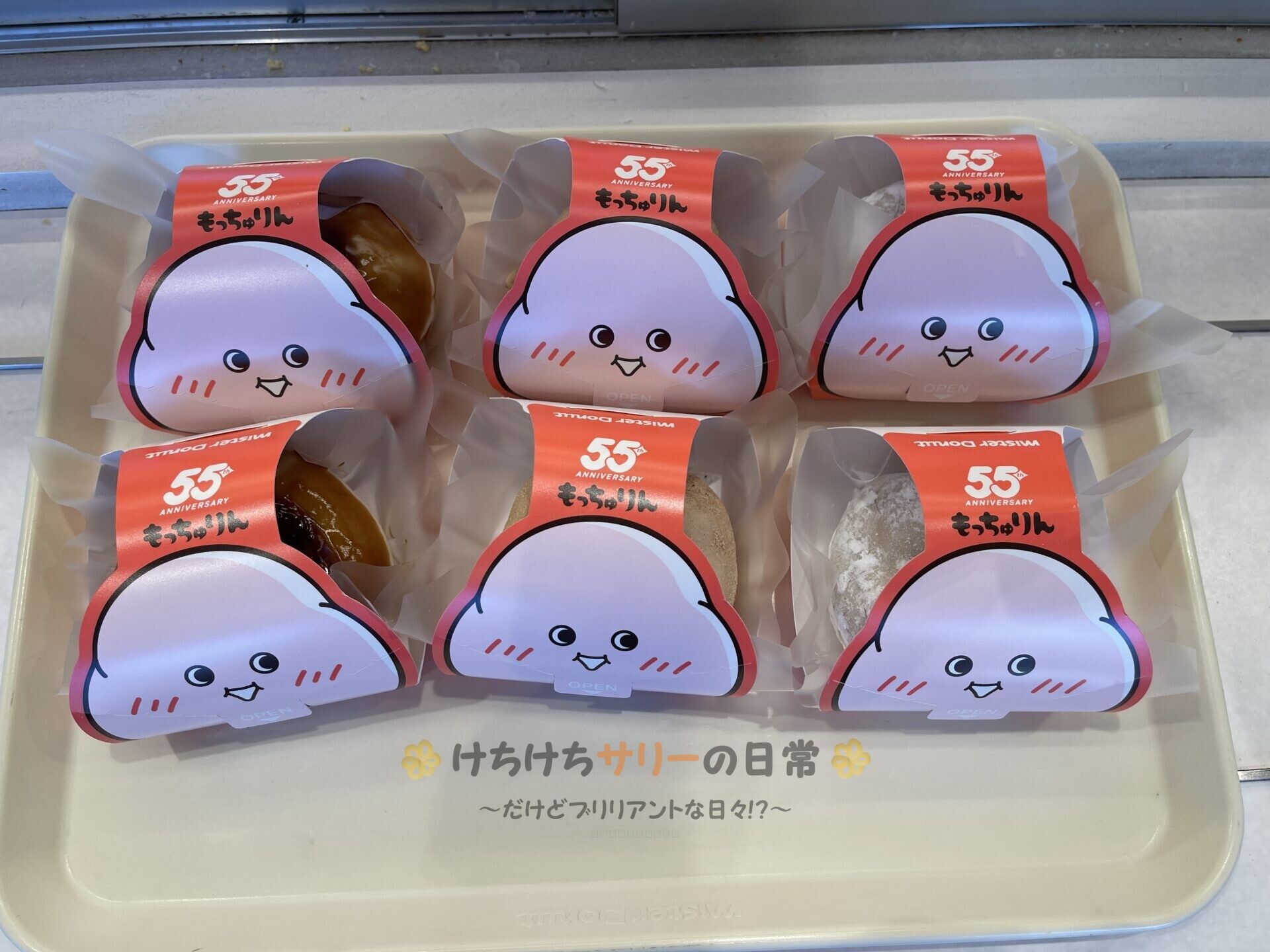 「もっちゅりん」はミスタードーナツ 55周年記念商品。もちもちのその先を目指して開発した新食感ドーナツで、6月4日(水)から期間限定で発売されたよ。 サリーが買いに来た6月5日は販売翌日という事もあって4種類のうち3種類買うことができたけど、その後、SNSで超話題になって長蛇の列ができる騒ぎになってたよ。