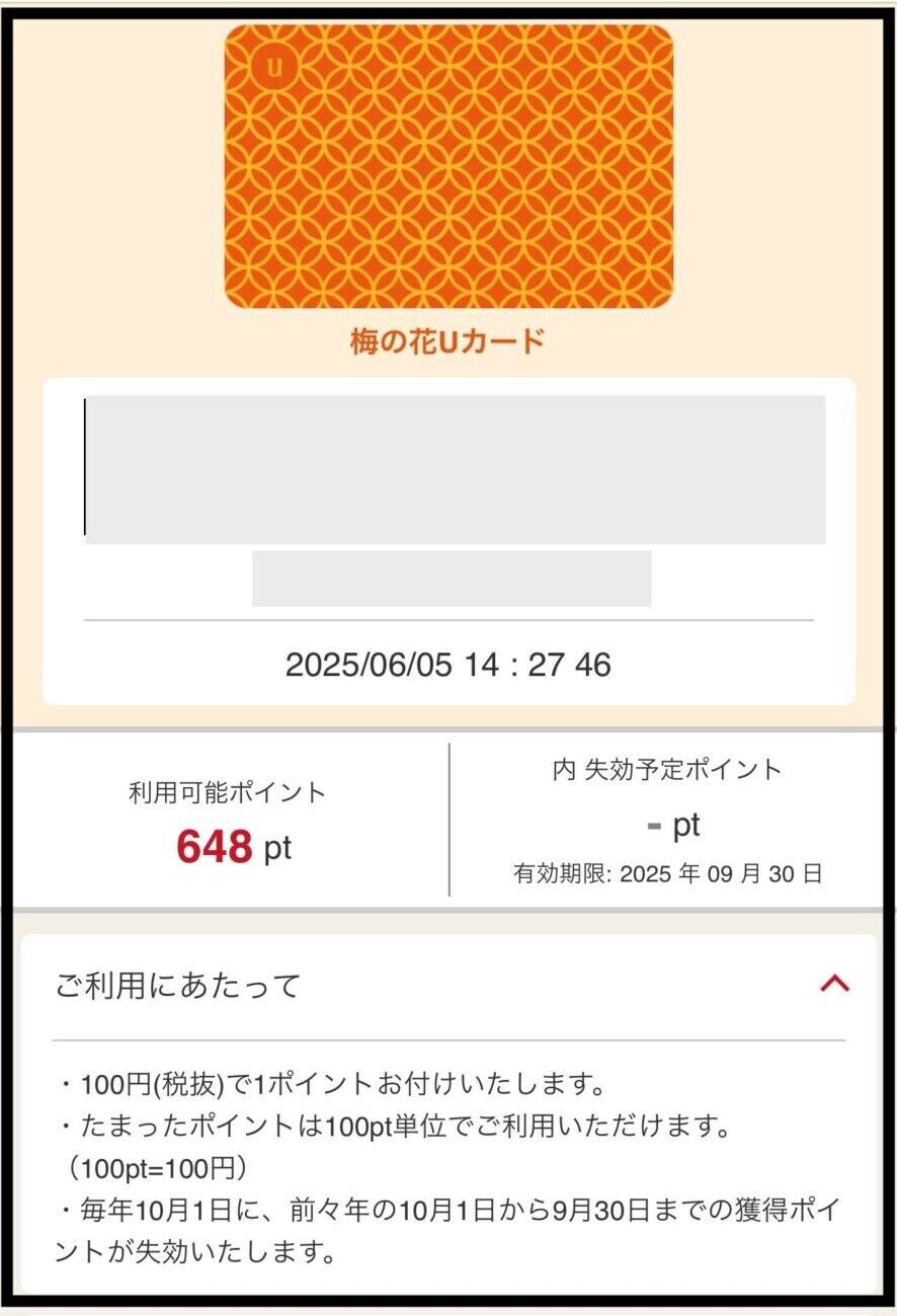 ・買い物代(梅の花):32円(ポイント利用で648円割引)