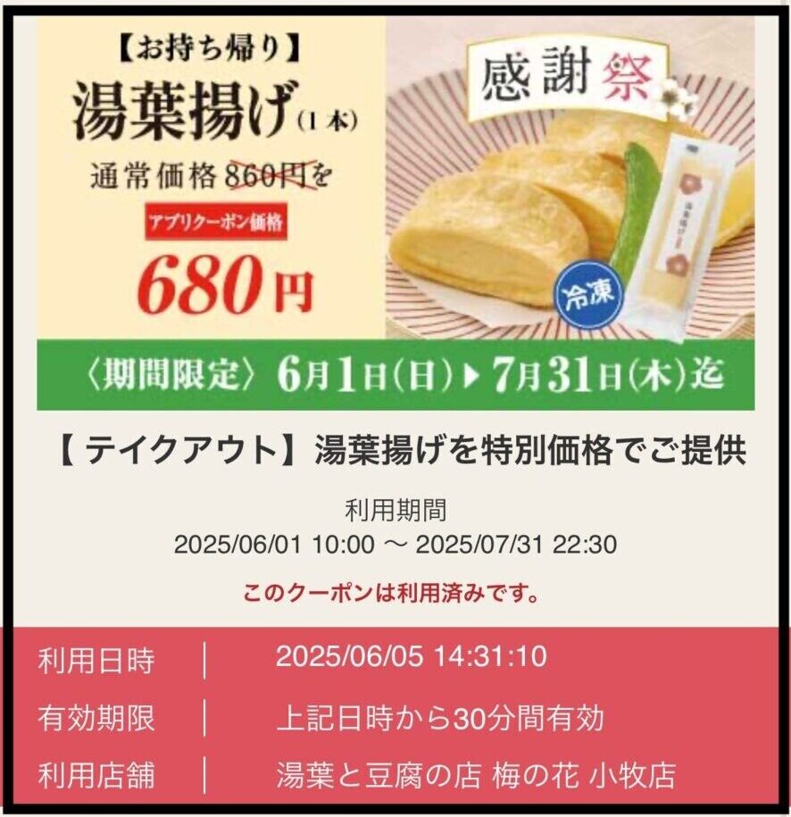 なるべく持ち出しが少ないようにしたいから何にしようか悩んだんだけど、アプリをチラッと見たら「【お持ち帰り】湯葉揚げ(1本)」が通常価格860円の所680円で買えるというクーポンが出てきた👀