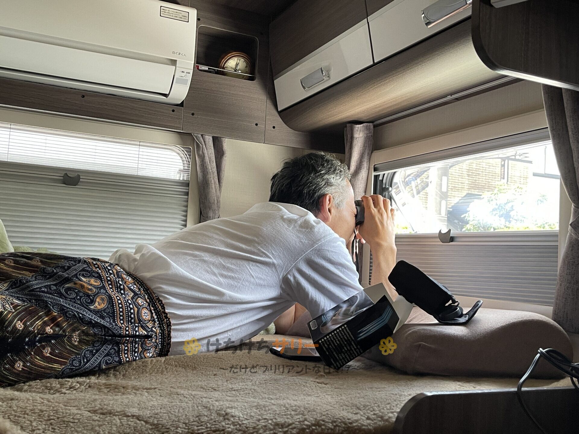 実家宛に送ってサリーママに代理で受け取ってもらったので、相方が双眼鏡の実力をチェック中🕶