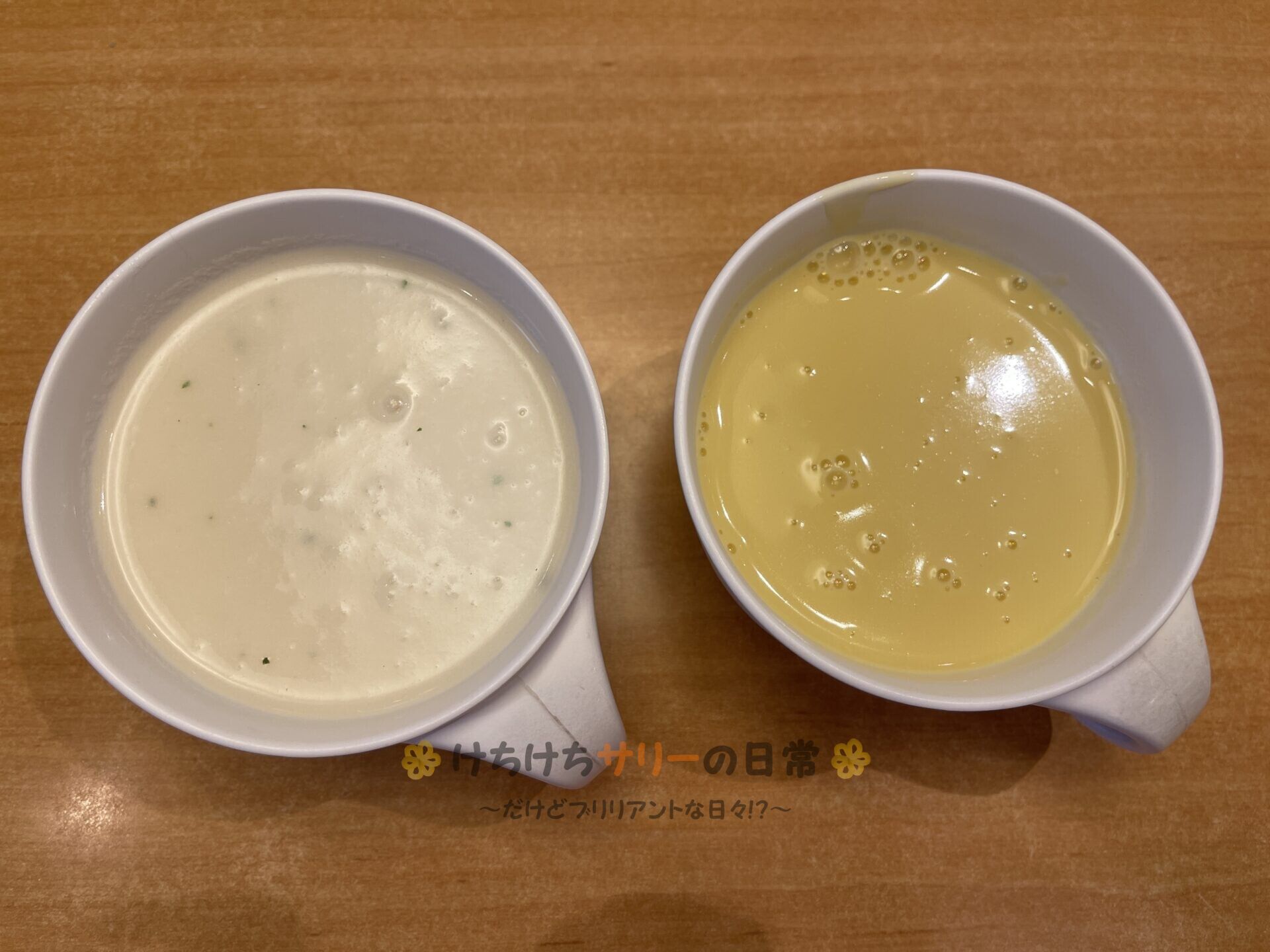 左は「じゃがいものスープ」、右は「コーンポタージュスープ」。