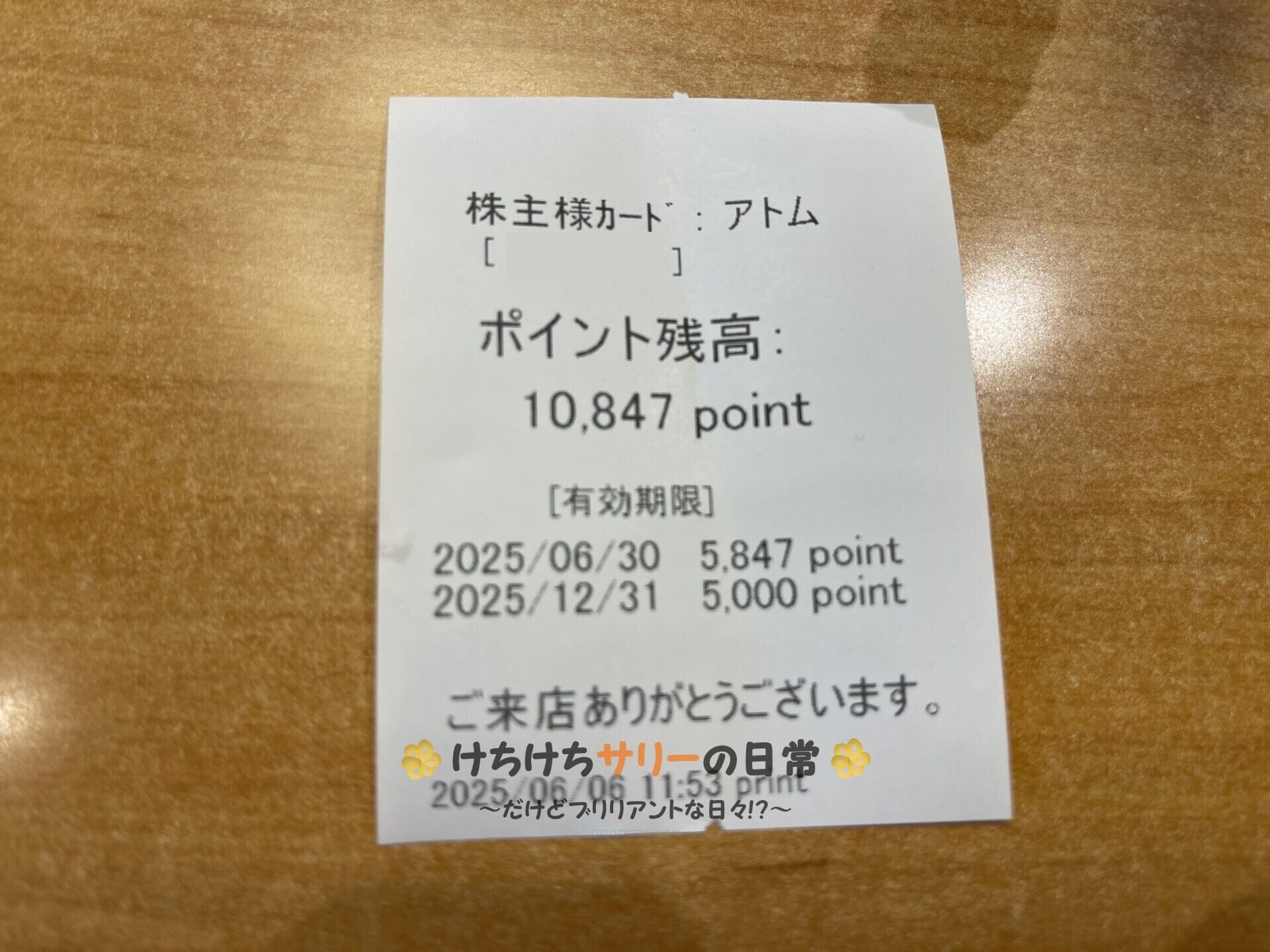 実はここのお店に来たのには訳があるよ😉 サリーはアトムの株主なんだけど、2025年6月30日に5,847円分のポイントが消えちゃうの😱