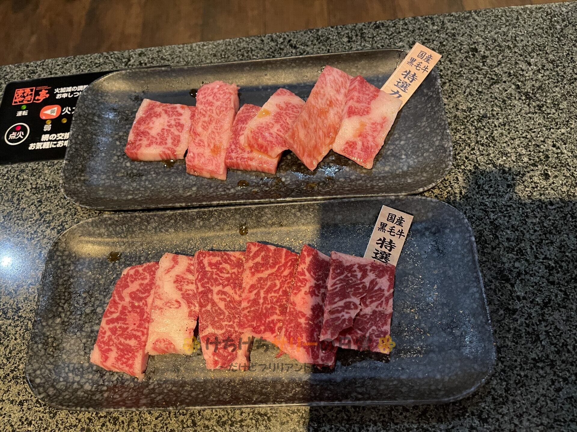 「国産黒毛牛特選カルビ:715円」とさっき食べて美味しかったから「国産黒毛和牛特選ロース:759円」も追加で注文。 ちなみにこの後特選カルビはもう2皿追加で食べたよ😋