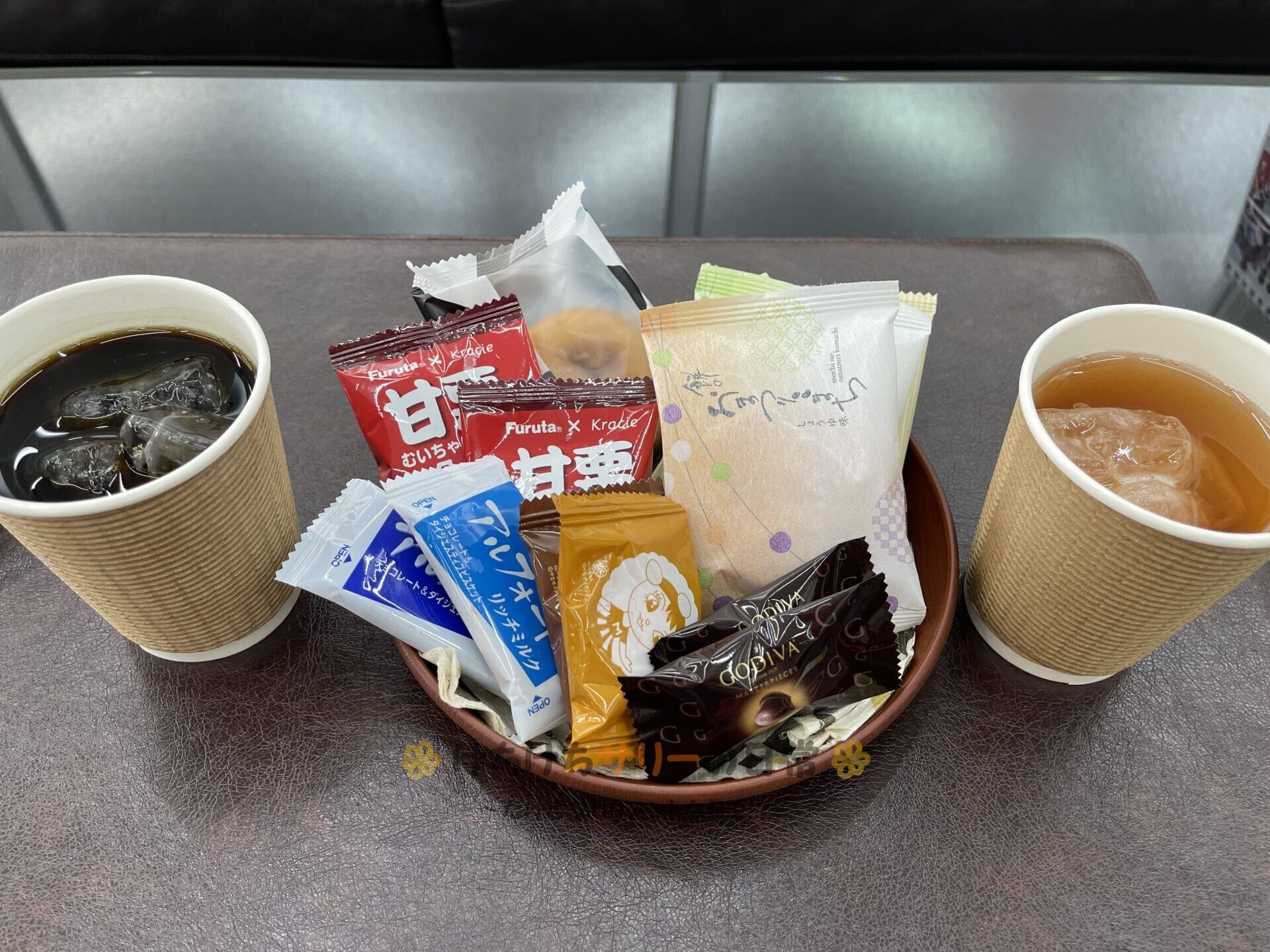 サービスの方に症状を話した後はいつものように飲み物とお菓子でおもてなしをしてもらい、お喋りしながら待つサリーと相方。