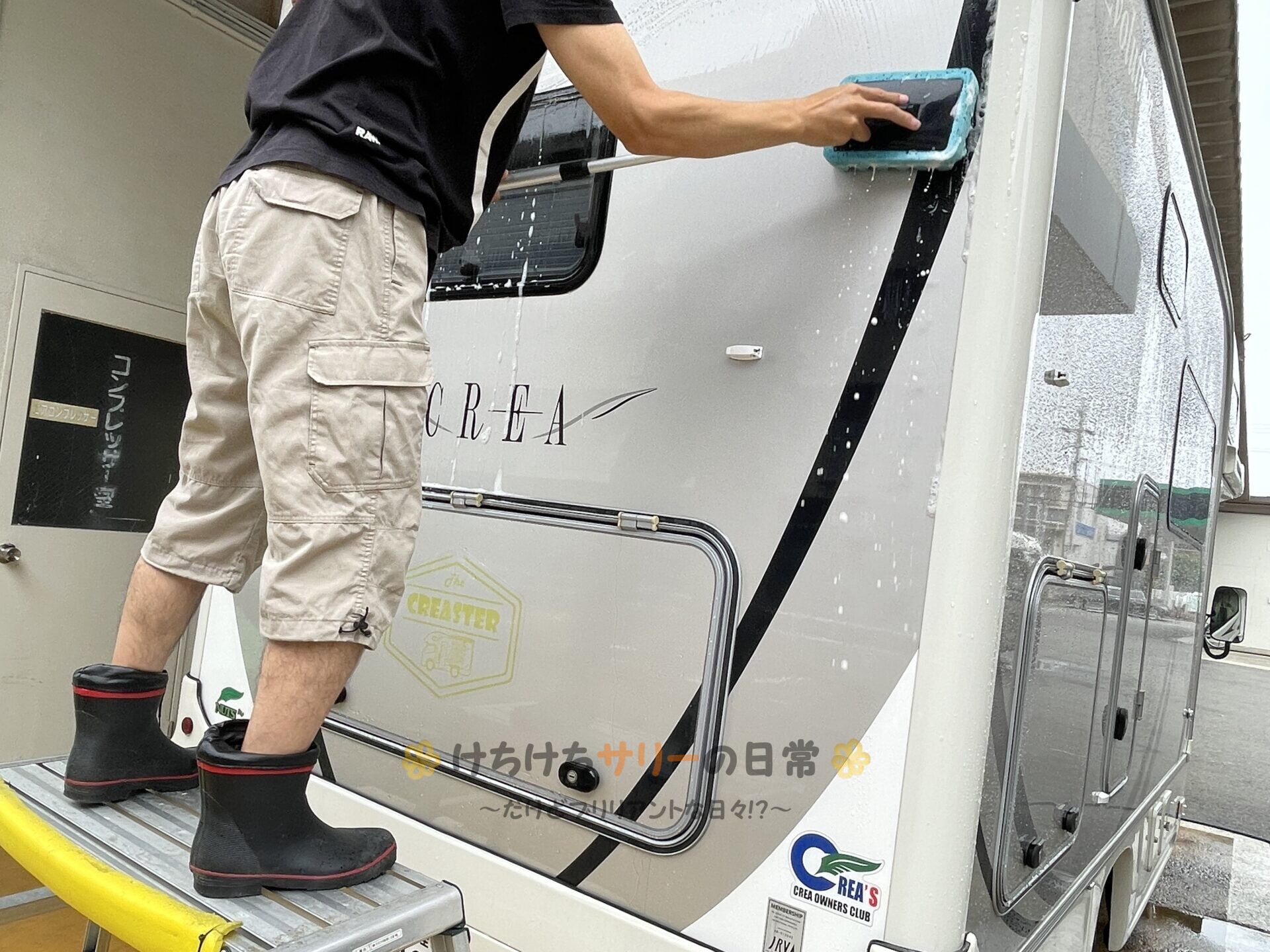 ナッツRVの洗車場を借りてマイペンライ号を綺麗に掃除するサリーと相方。