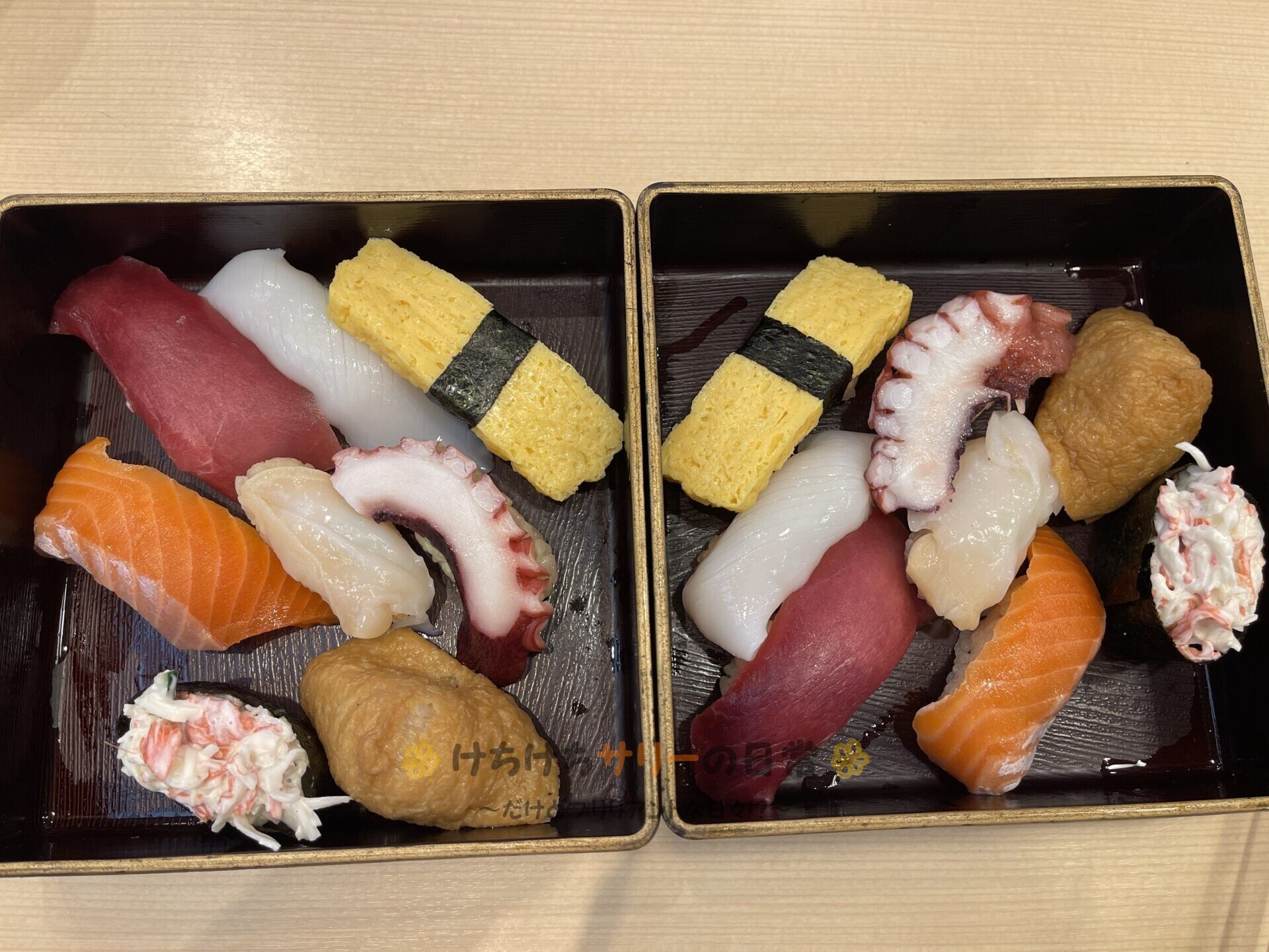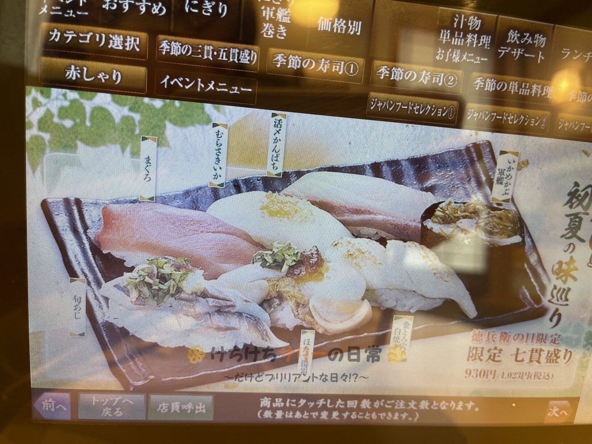 七貫盛りの内容は「まぐろ:429円」、「むらさきいか:319円」、「活〆かんぱち:616円」、「いかめかぶ軍艦:198円」、「金とろ穴子白焼き:429円」、「ほたて湯霜:385円」、「旬あじ:385円」で合計は2761円。一人分は1380.5円の計算になるので実質357.5円のお得🤩