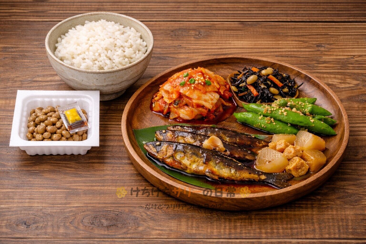 夕ご飯は「ご飯」、「納豆」、「鮎の甘露煮」、「キムチ」、「ひじき」、「エンドウの味噌和え」、「大根の煮物」だよ。