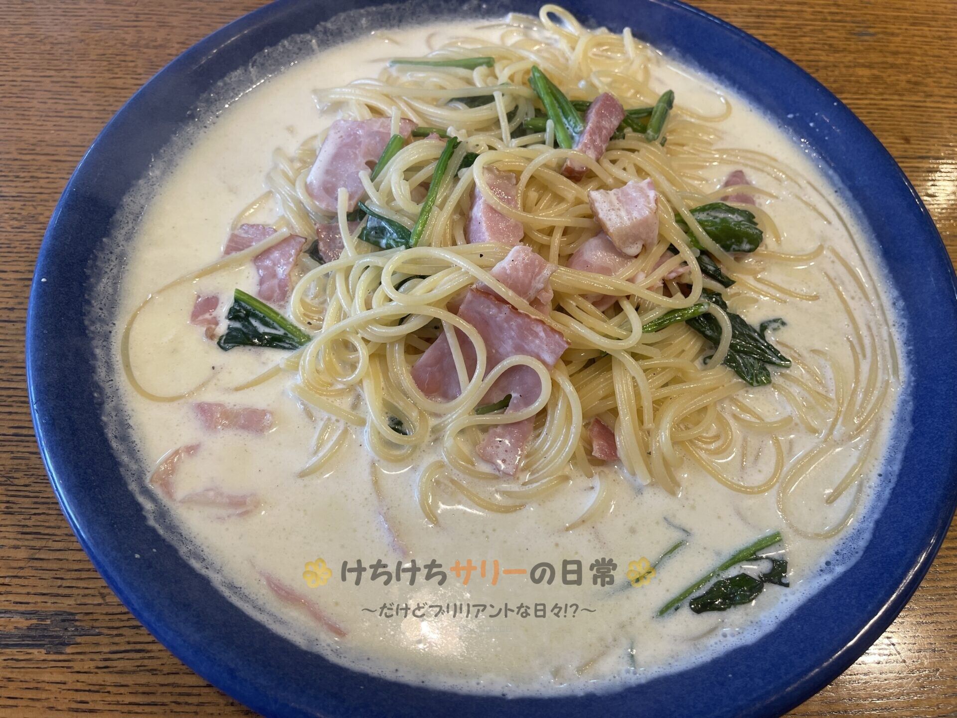 コンサバ(保守的)なサリーと相方はこの日も「生クリーム煮込みほうれん草とベーコン:1180円+ビッグ200円」と、