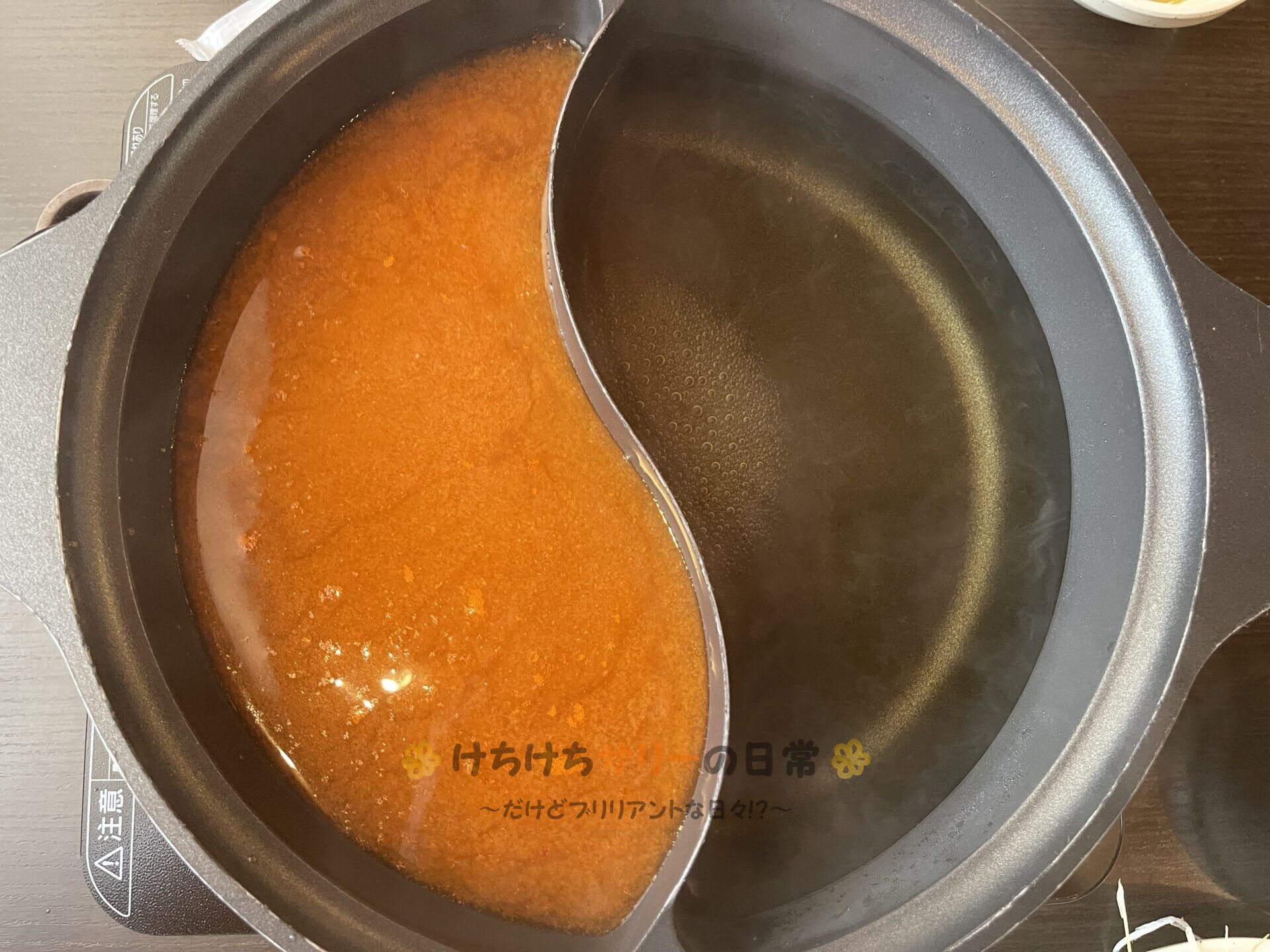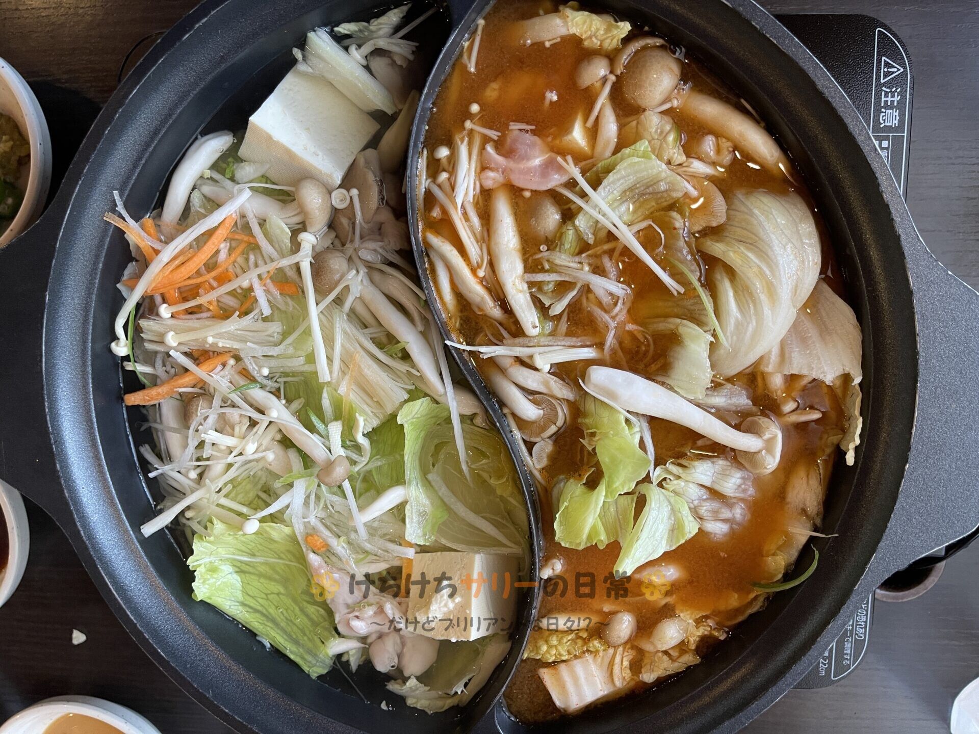 この日選んだ鍋のだしは、『基本の白だし(これは最初から決まってて変更するには追加料金が必要)』と『赤チゲ味噌だし』だよ。