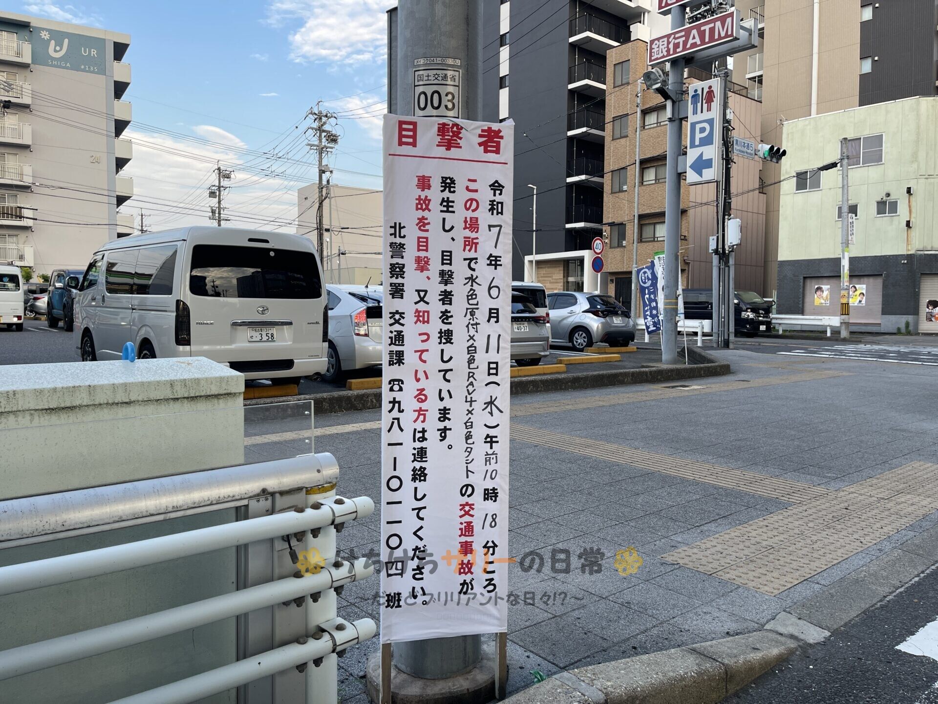 お買い物の後、事故現場を通ってみたら警察が置いた目撃者探しの看板が置かれてた👇