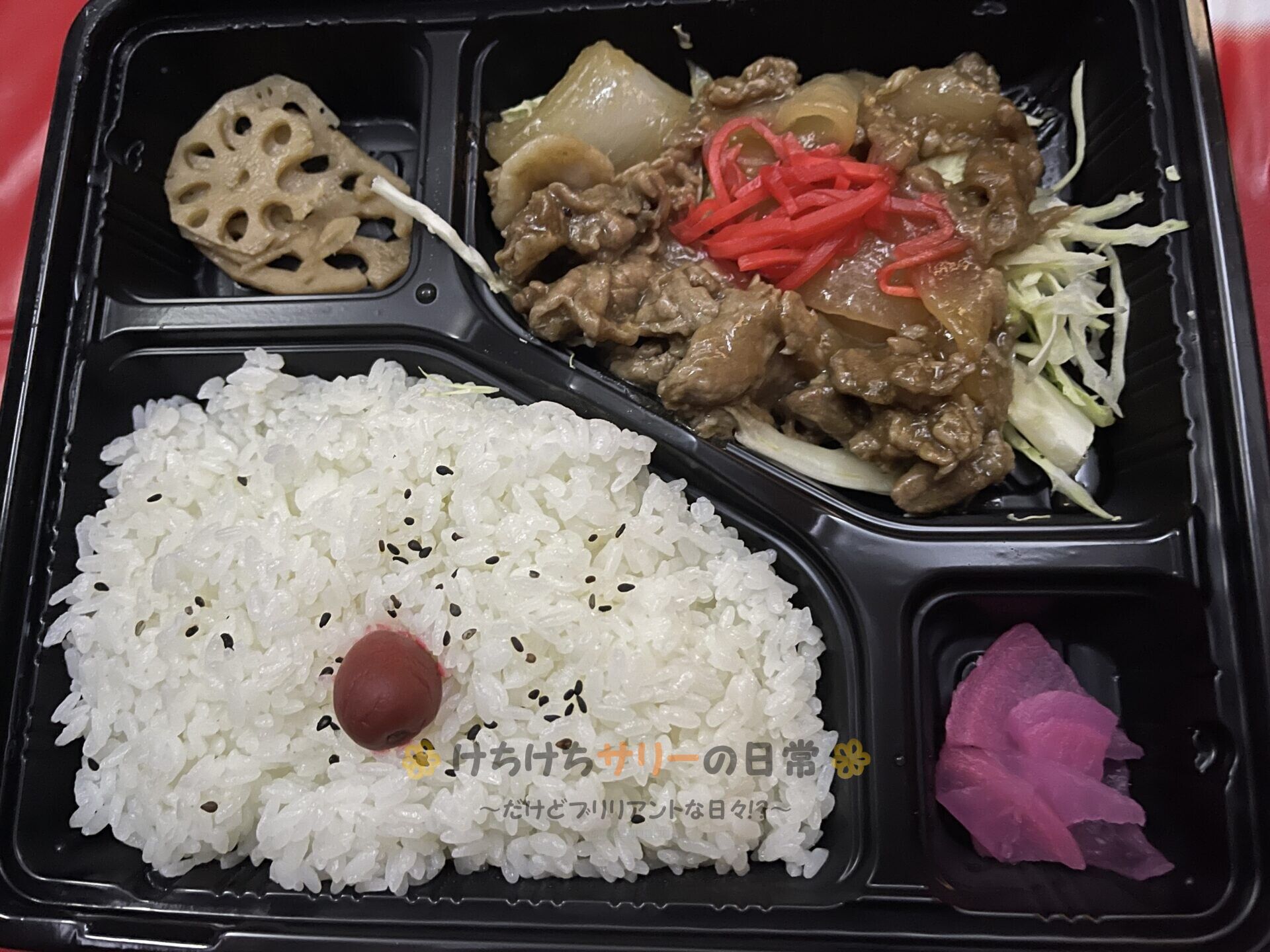 この日の夕ご飯はウオダイで買った「生姜焼き弁当:270円」×2個。