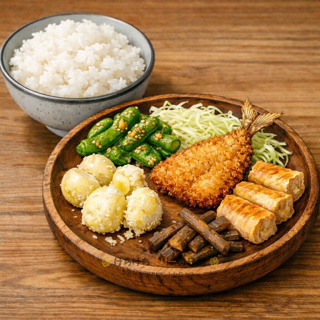 夕ご飯は「ご飯」、「アジフライ」、「エンドウの味噌和え」、先日ポイントで購入した梅の花の「湯葉揚げ」、「ごぼうの漬物」、「粉吹き芋」だよ。