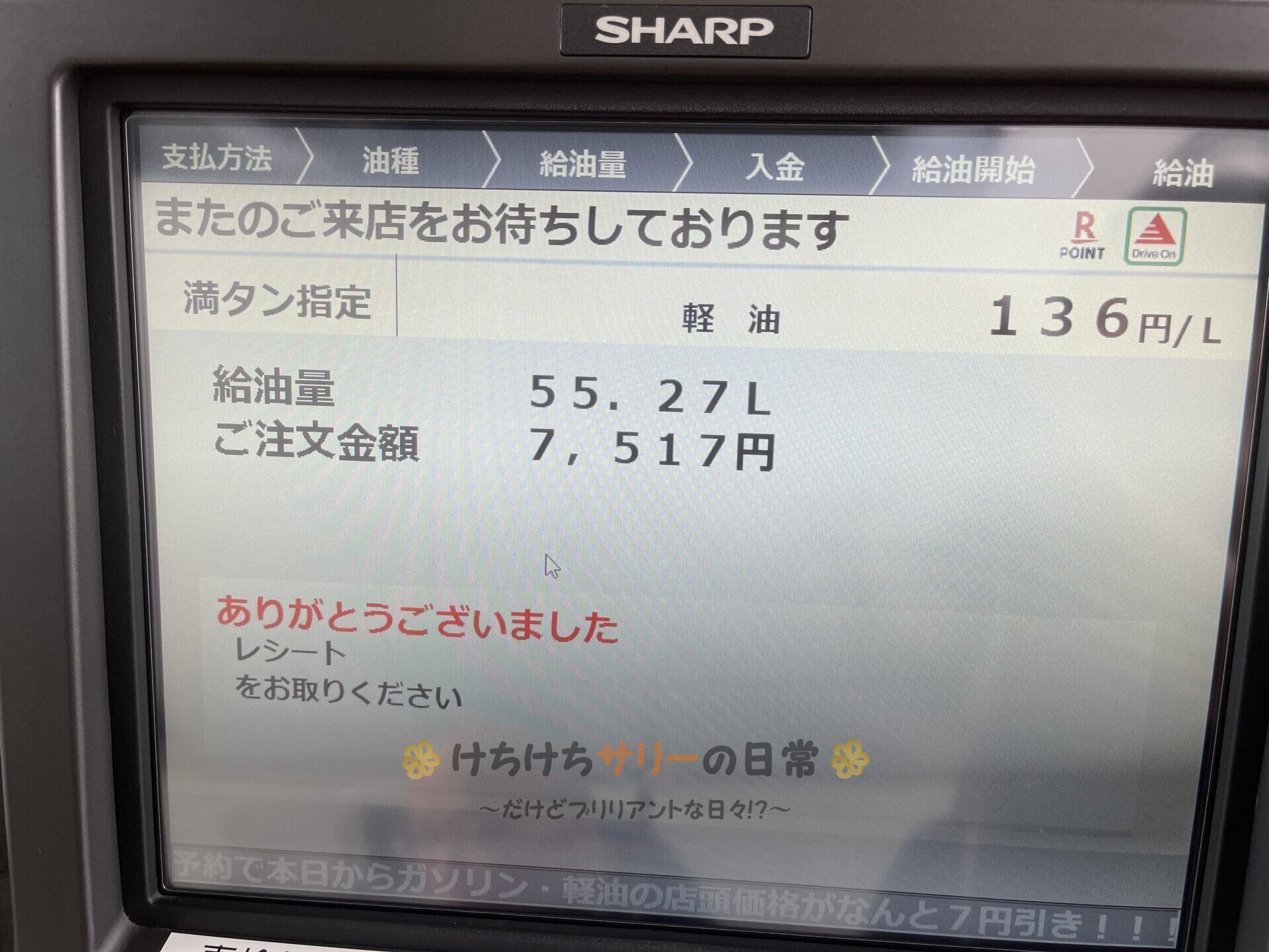 軽油は本来は1リットル139円のところ、アプリクーポンを使ったので136円に🉐 満タン給油で55.27リットル入って7,517円だったよ。