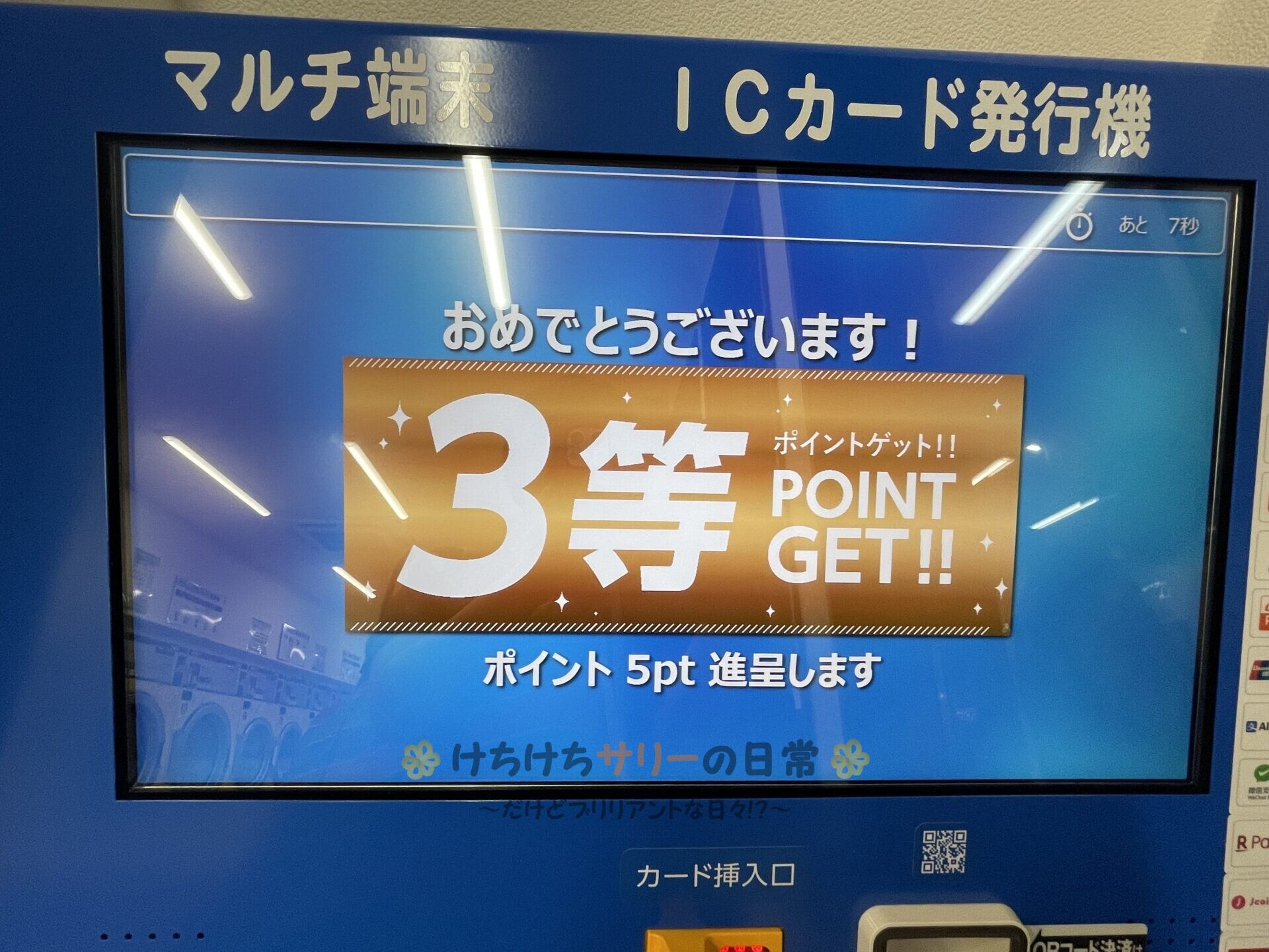 いつも来るコインランドリーなので、カードにお金を1,000円入れたら今回は3等で5ポイントゲット👍