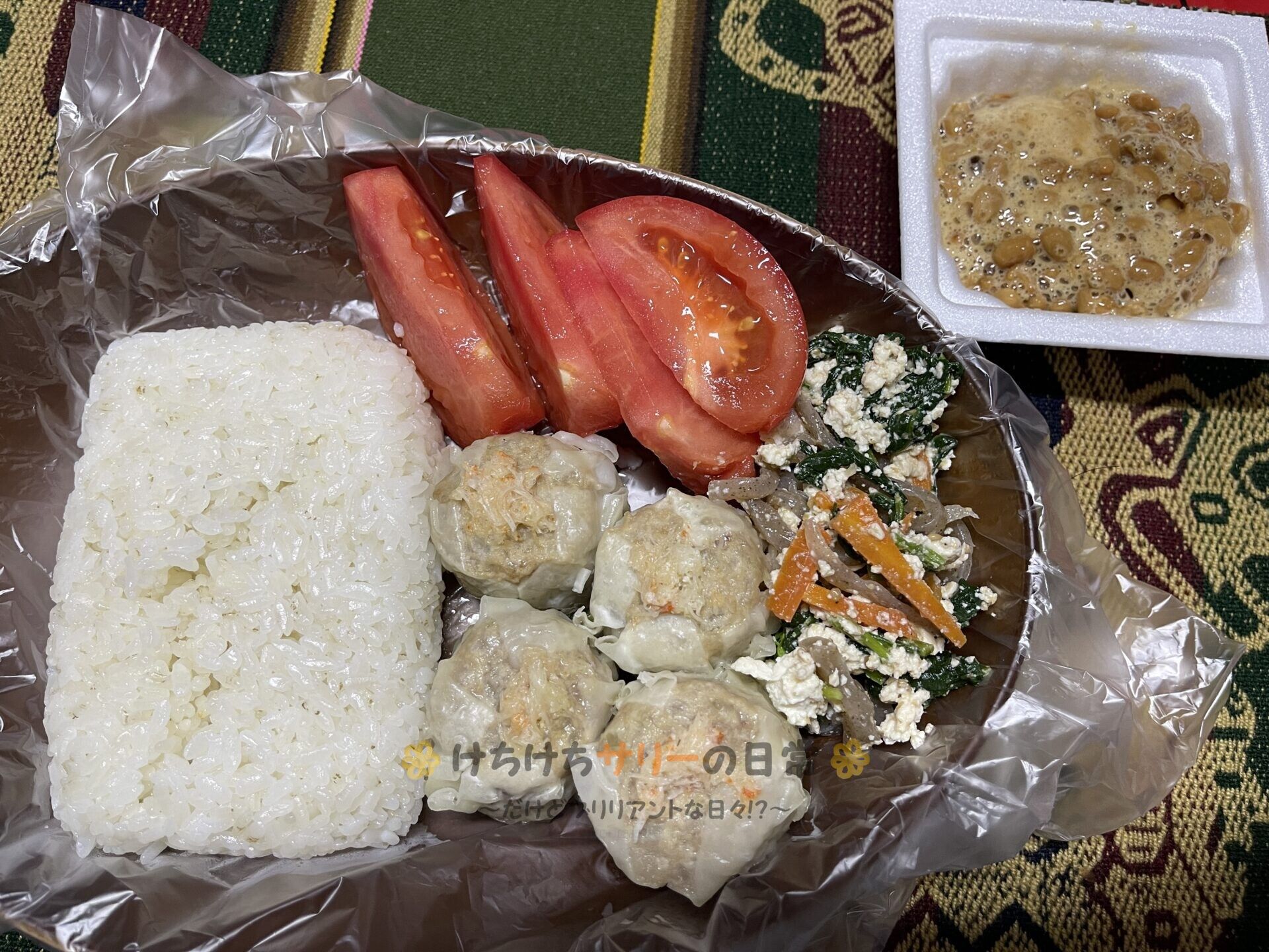 この日の夕ご飯は「サリーママからもらった冷凍ご飯」、「納豆」、「シウマイ」、「こんにゃくとほうれん草とにんじんの入った白和え」、「トマト」だよ。