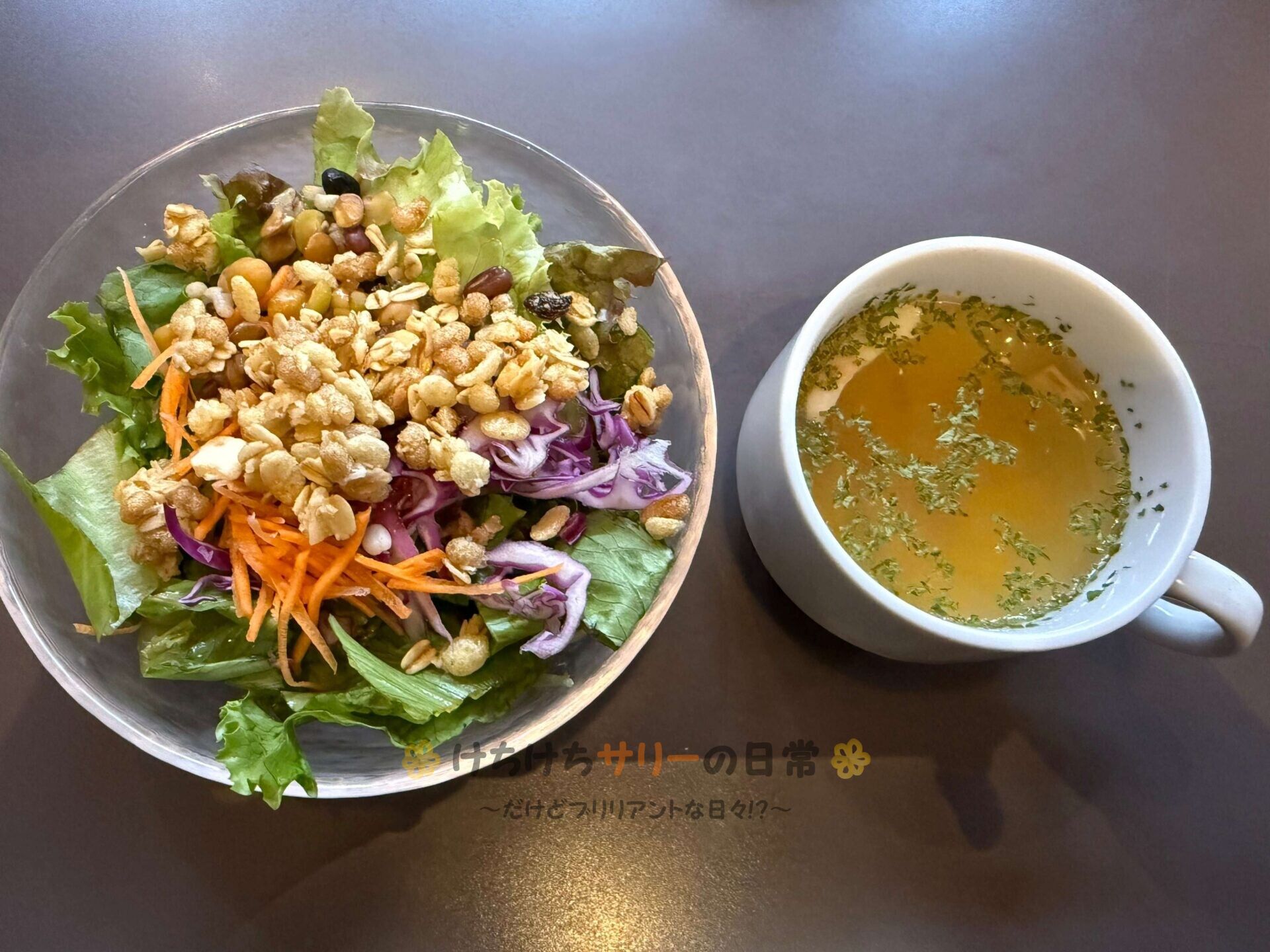 まずはサラダとスープ。 グラノーラがのった健康的なサラダ🥗