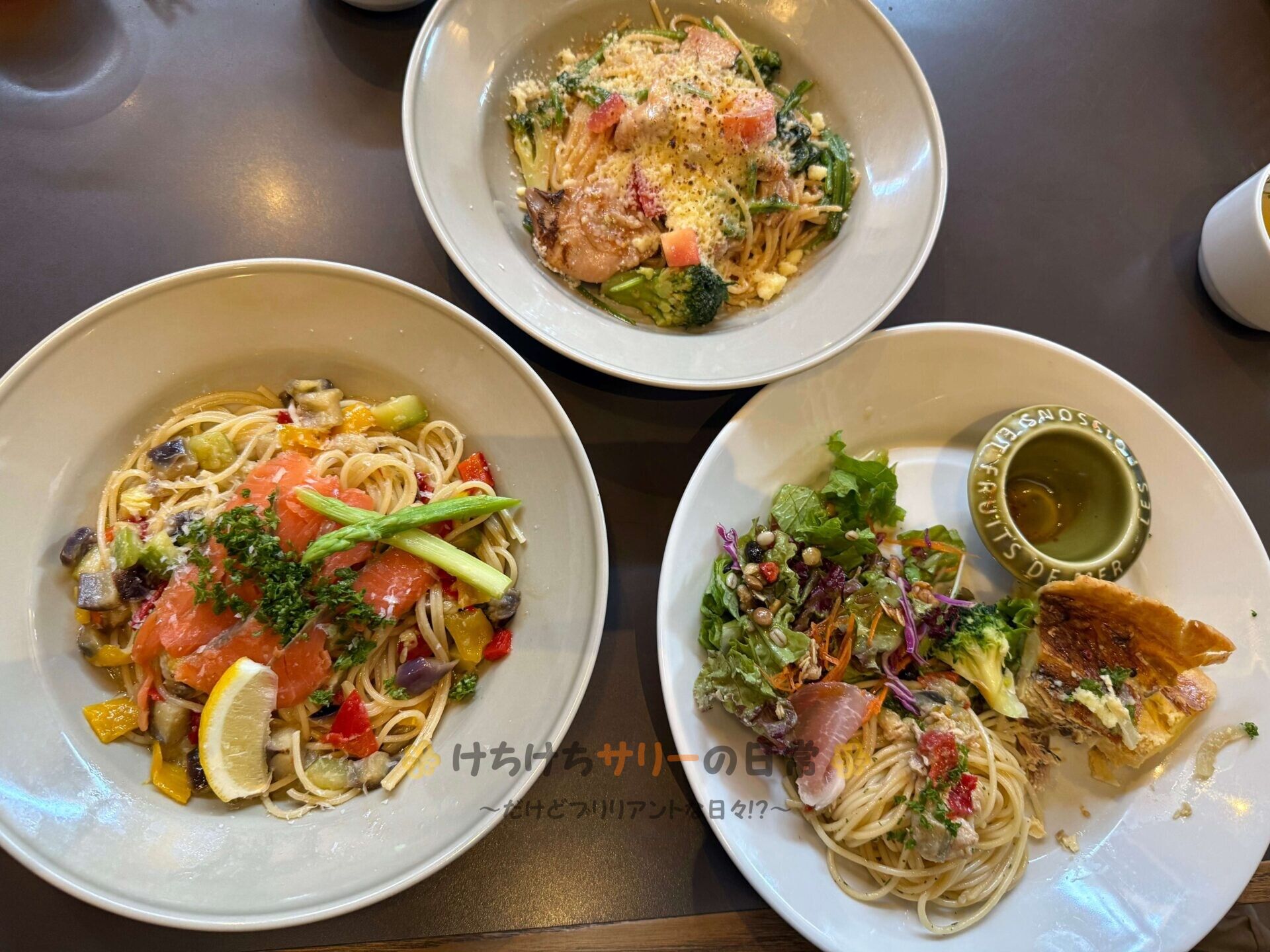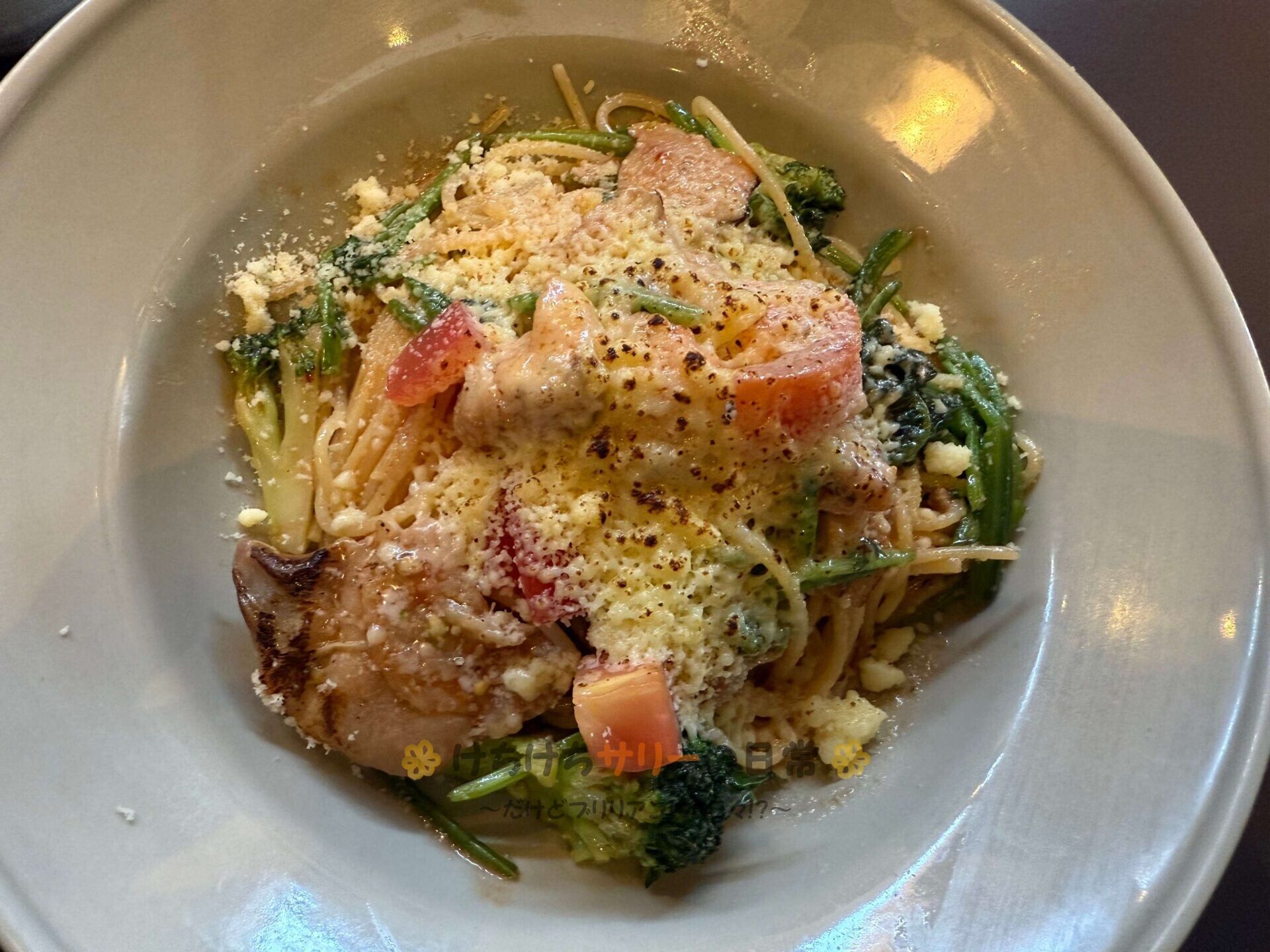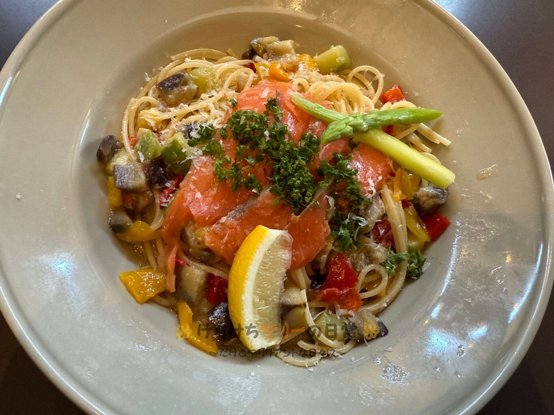 相方ママが注文したのは「〜さっぱりレモンのアクセント〜 夏野菜とサーモンのオイルパスタ 」だよ。
