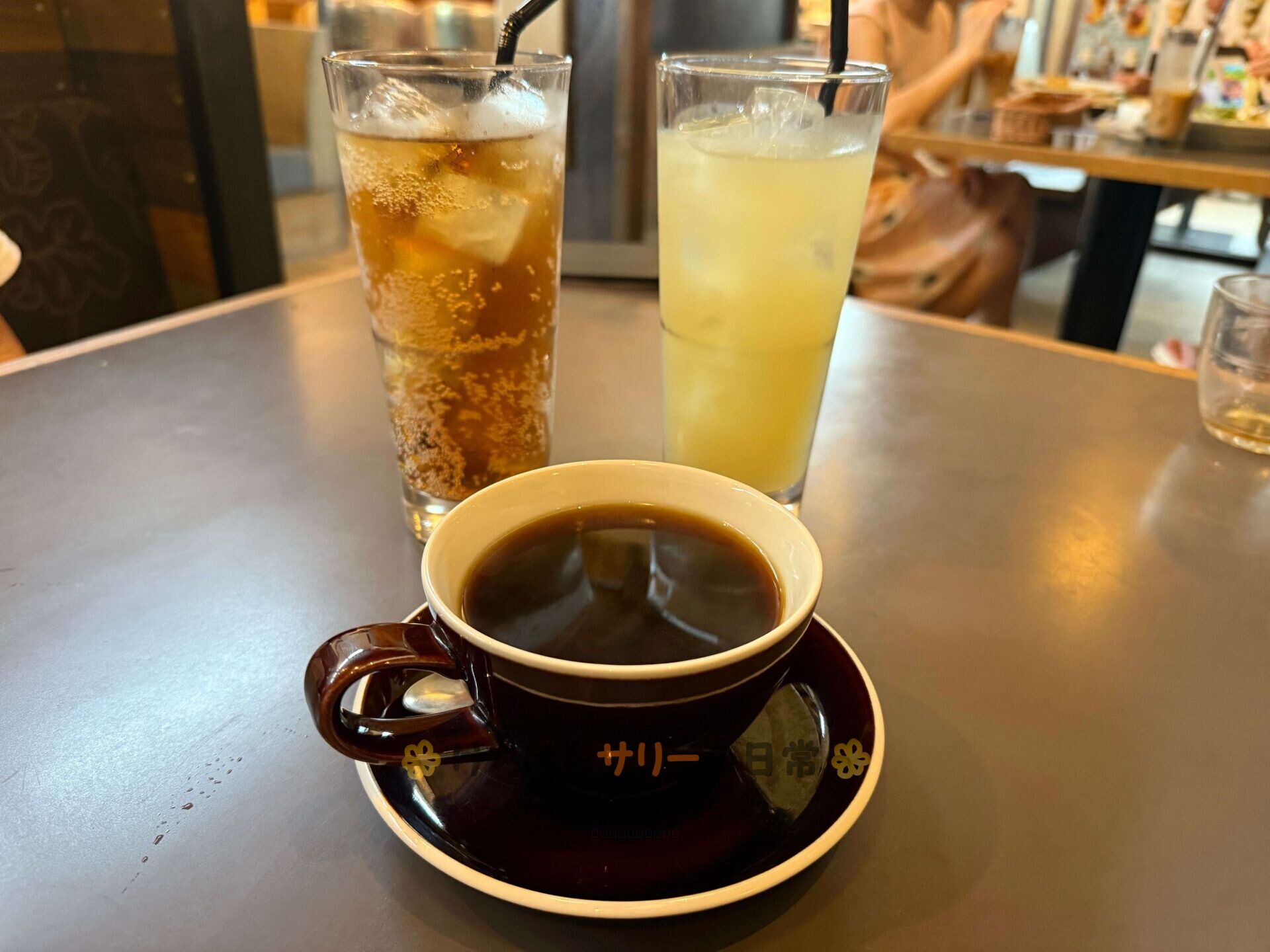 食後のドリンクは相方が「辛口ジンジャーエール」、サリーは「グレープフルーツジュース」、相方ママは「ブレンド珈琲」だよ。