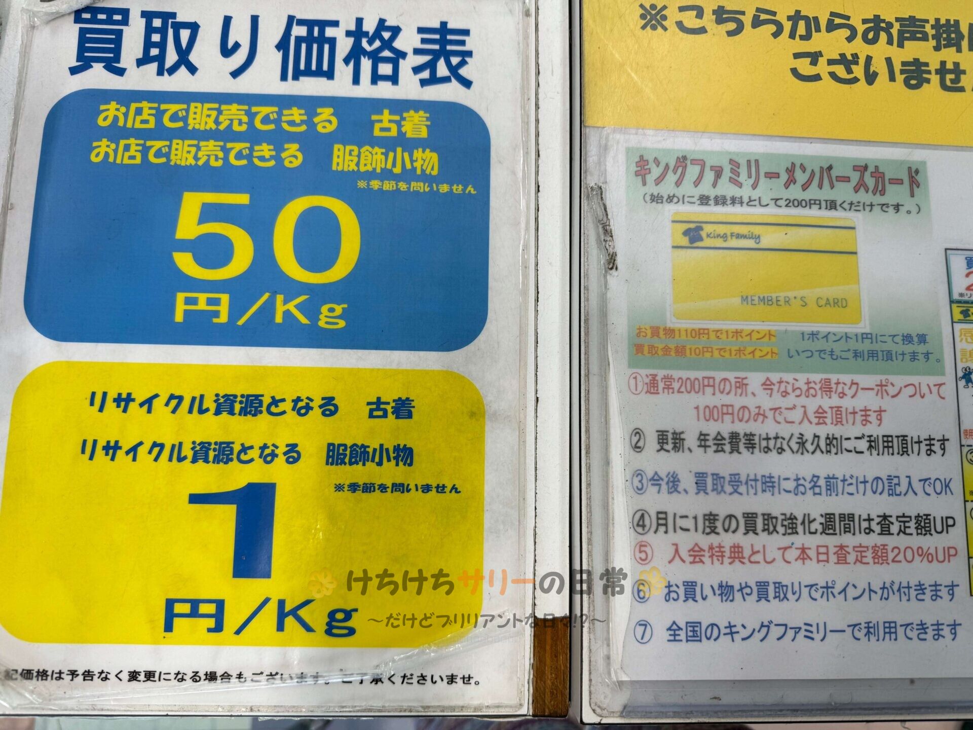 こちらのお店ではお店で販売できる古着は1Kg50円、もう売る事ができない古着は1Kg1円で買い取ってくれるの🙂