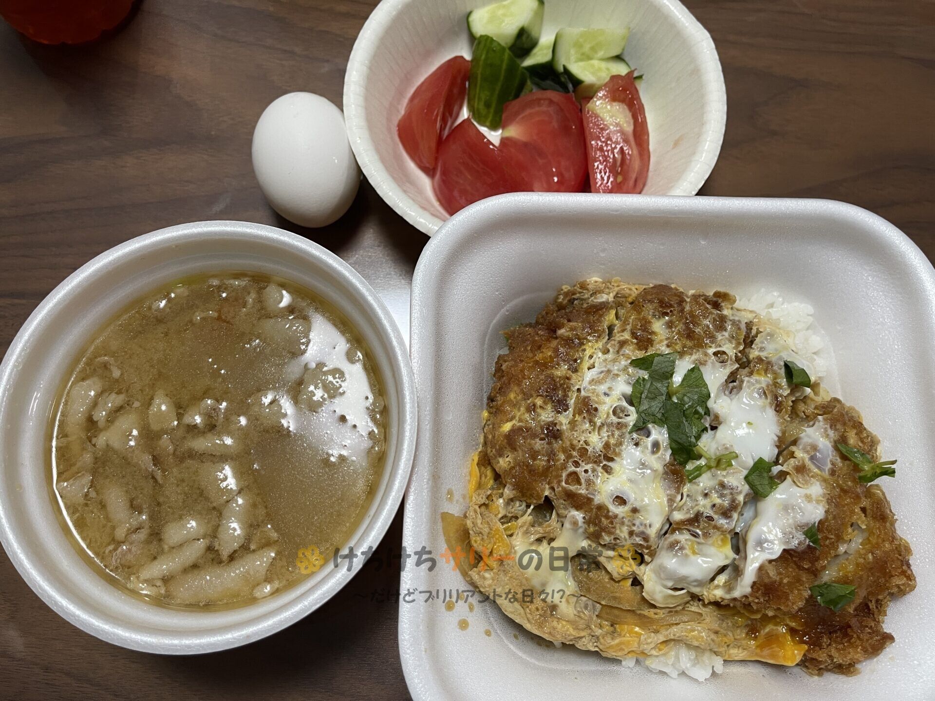 サリーは「カツ丼(竹):820円のところ感謝祭150円割引で658円」と「とん汁(大):216円」。 サラダとゆで卵はサリーママが準備してくれたもの。