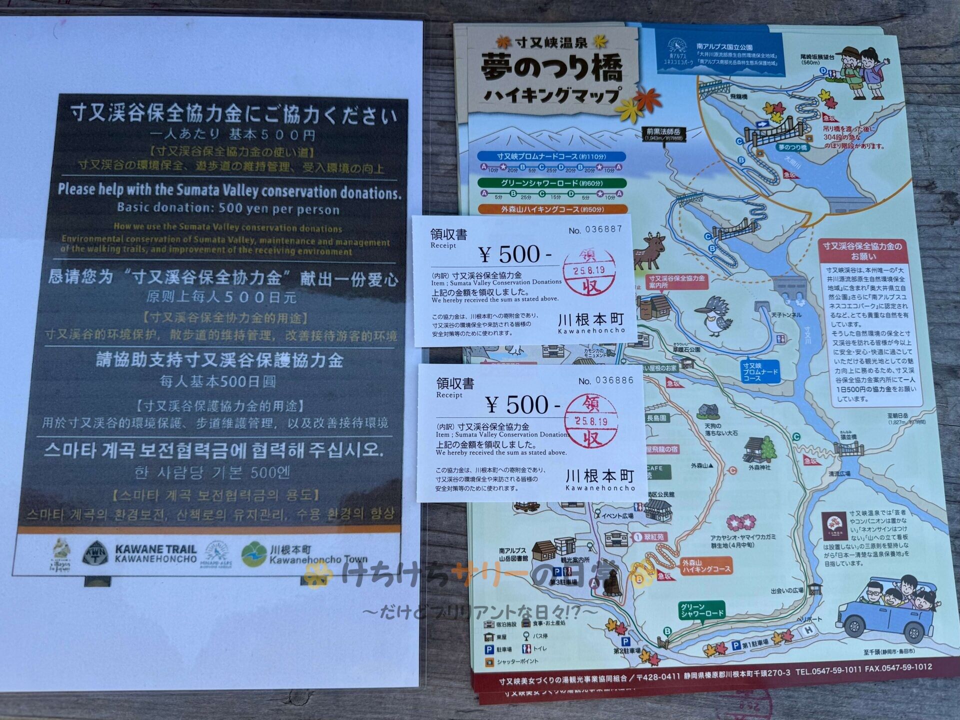 そうそう!! 寸又峡の入口に小屋があっておじさんが立ってるんだけど、そこで『寸又渓谷保全協力金』を要求されるよ。 金額は1人500円。