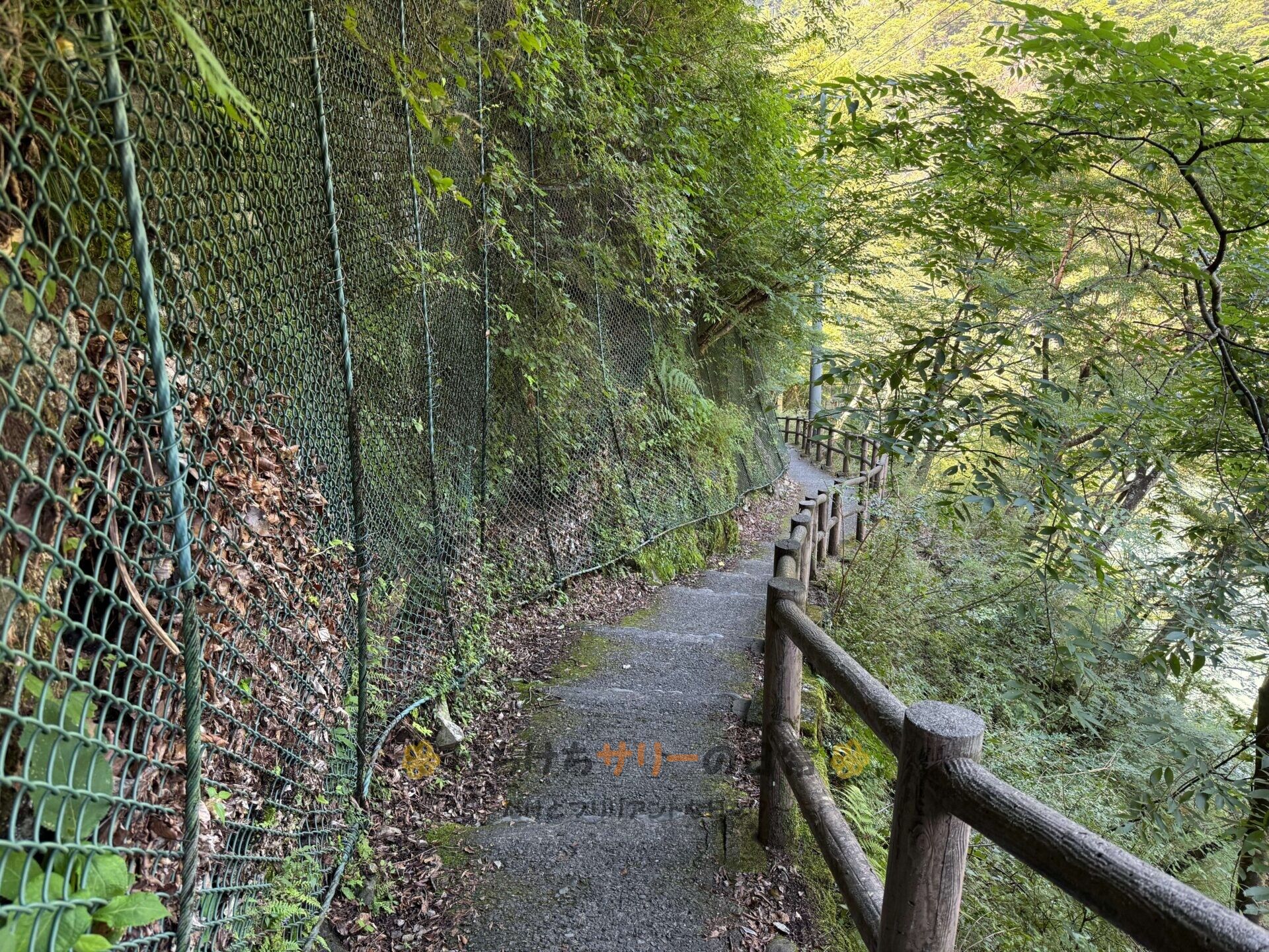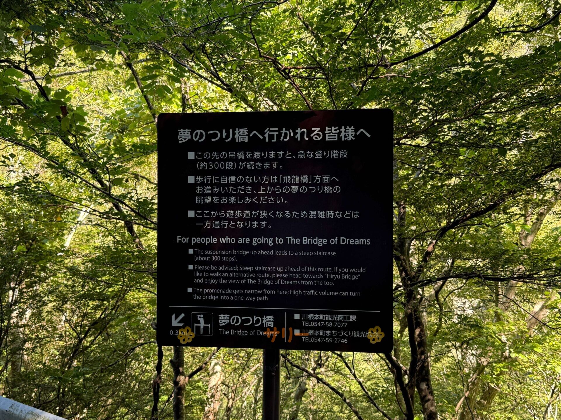 夢のつり橋まであと少し。 看板には『夢のつり橋を渡ると登り階段が300段あるから歩行に自信が無い人はつり橋を渡らずに上から眺めるように(つり橋は一方通行で戻る事ができない)』と書かれている☝