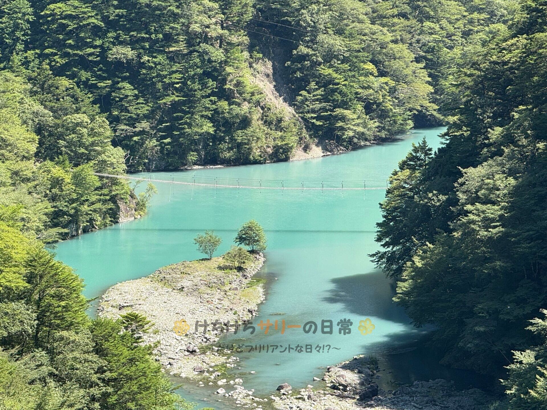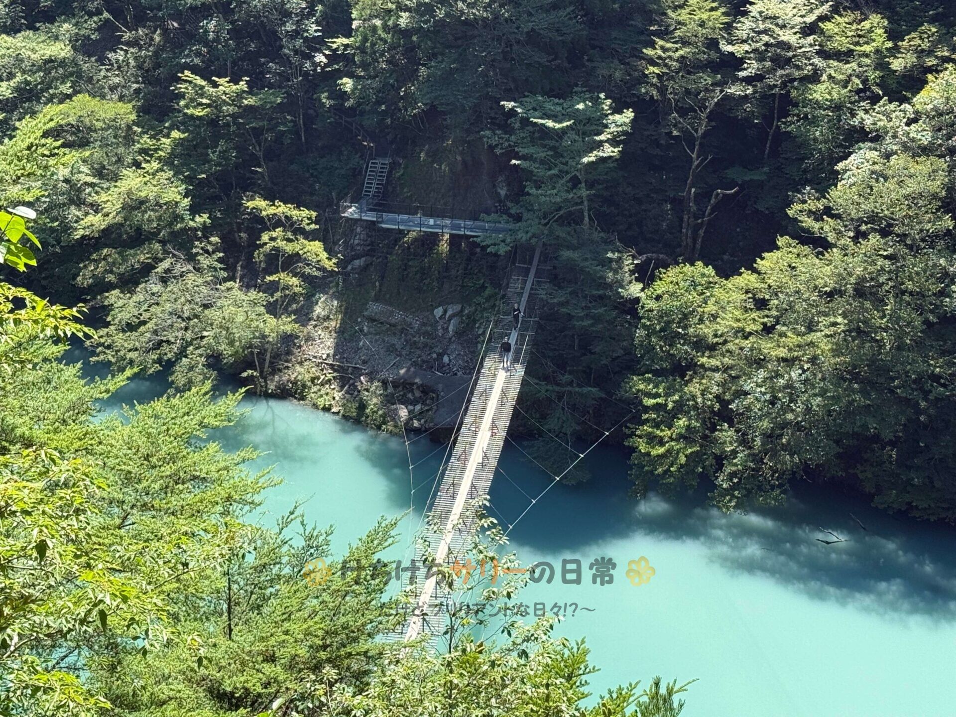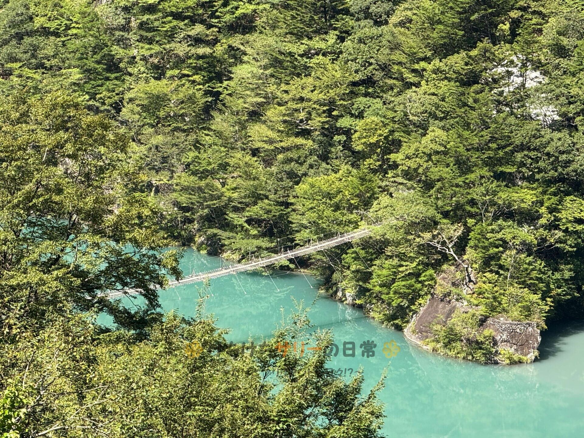 『夢のつり橋』は上から見るとこんな感じ👇 大間ダムが作り出すエメラルドグリーンの湖面が美しい✨