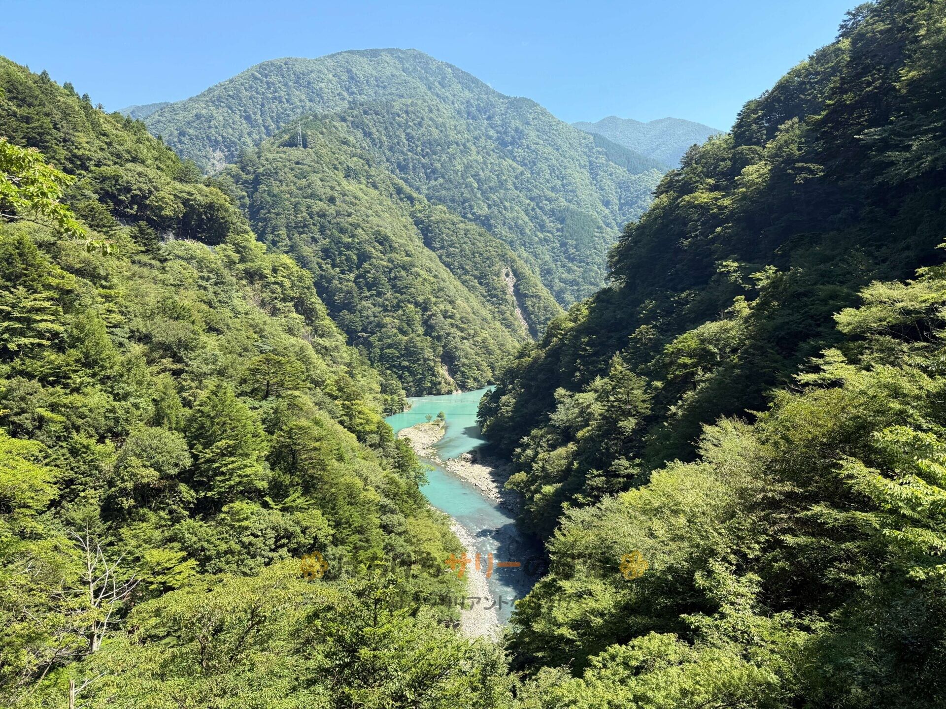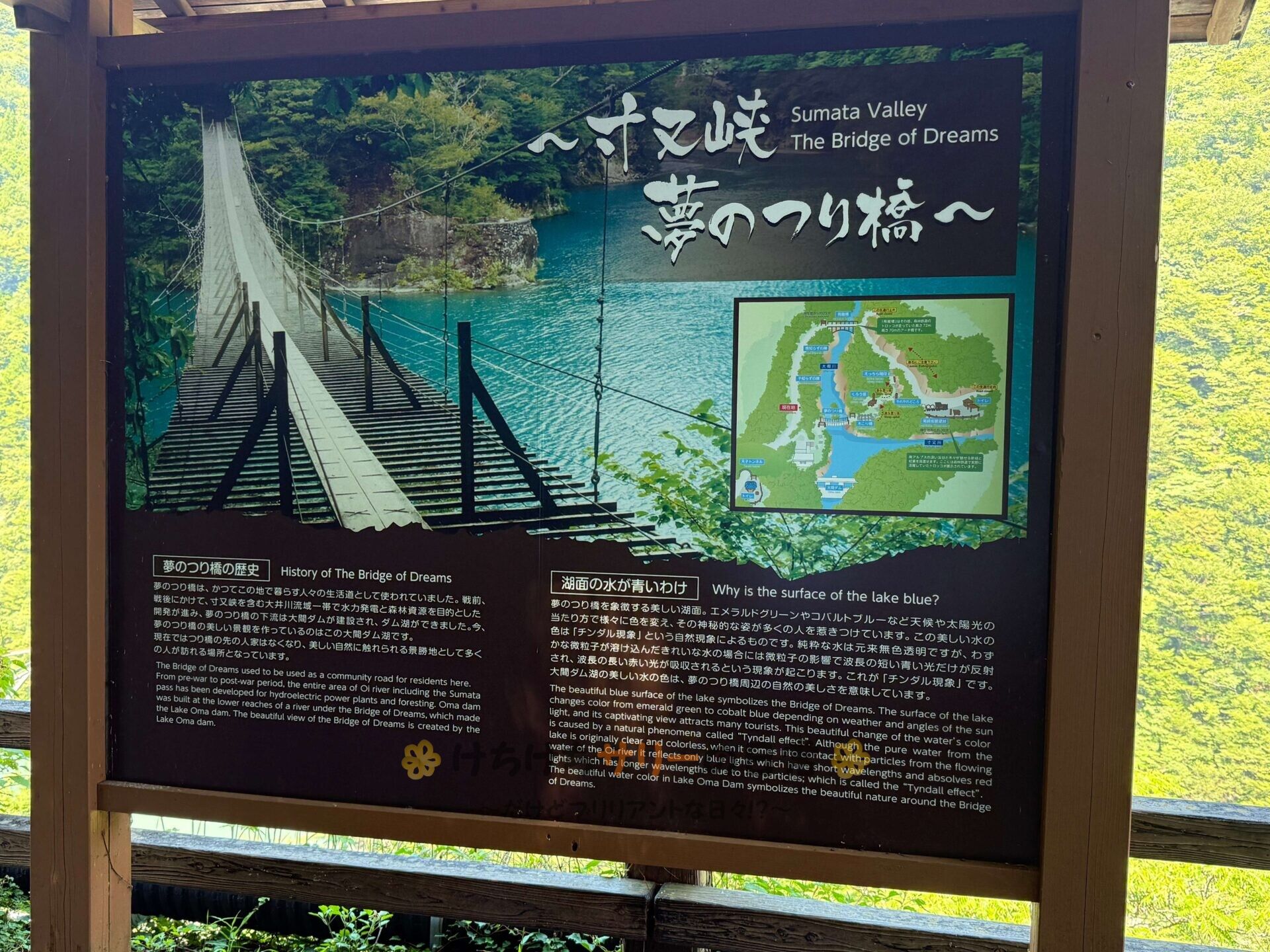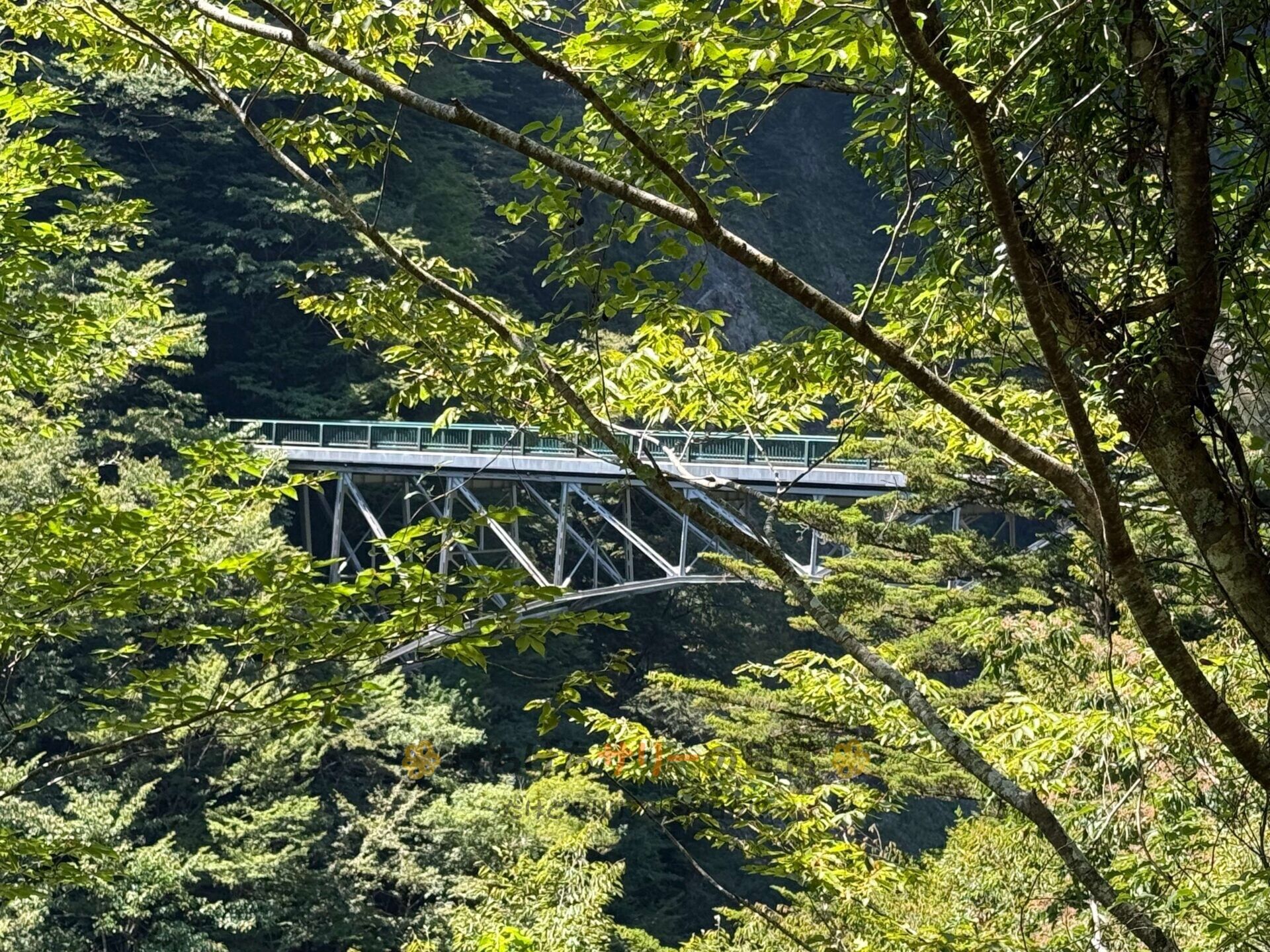 『夢のつり橋』は上から見るとこんな感じ👇 大間ダムが作り出すエメラルドグリーンの湖面が美しい✨