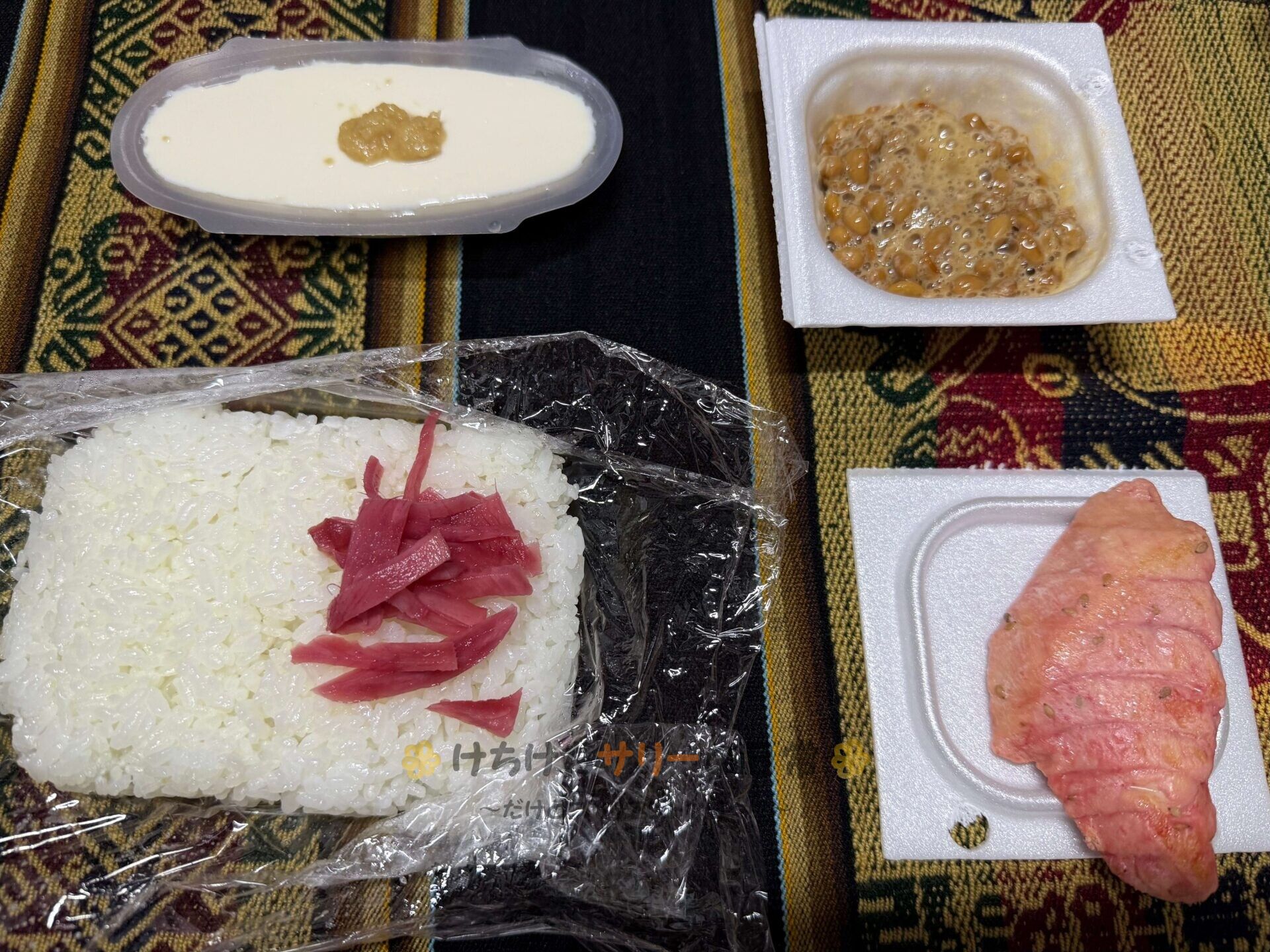 この日の夕ご飯は「冷凍ご飯」、「納豆」、「冷奴」、「脂カレイ:半額で1匹167円」、「相方ママ手作りの生姜漬け梅風味」だよ。