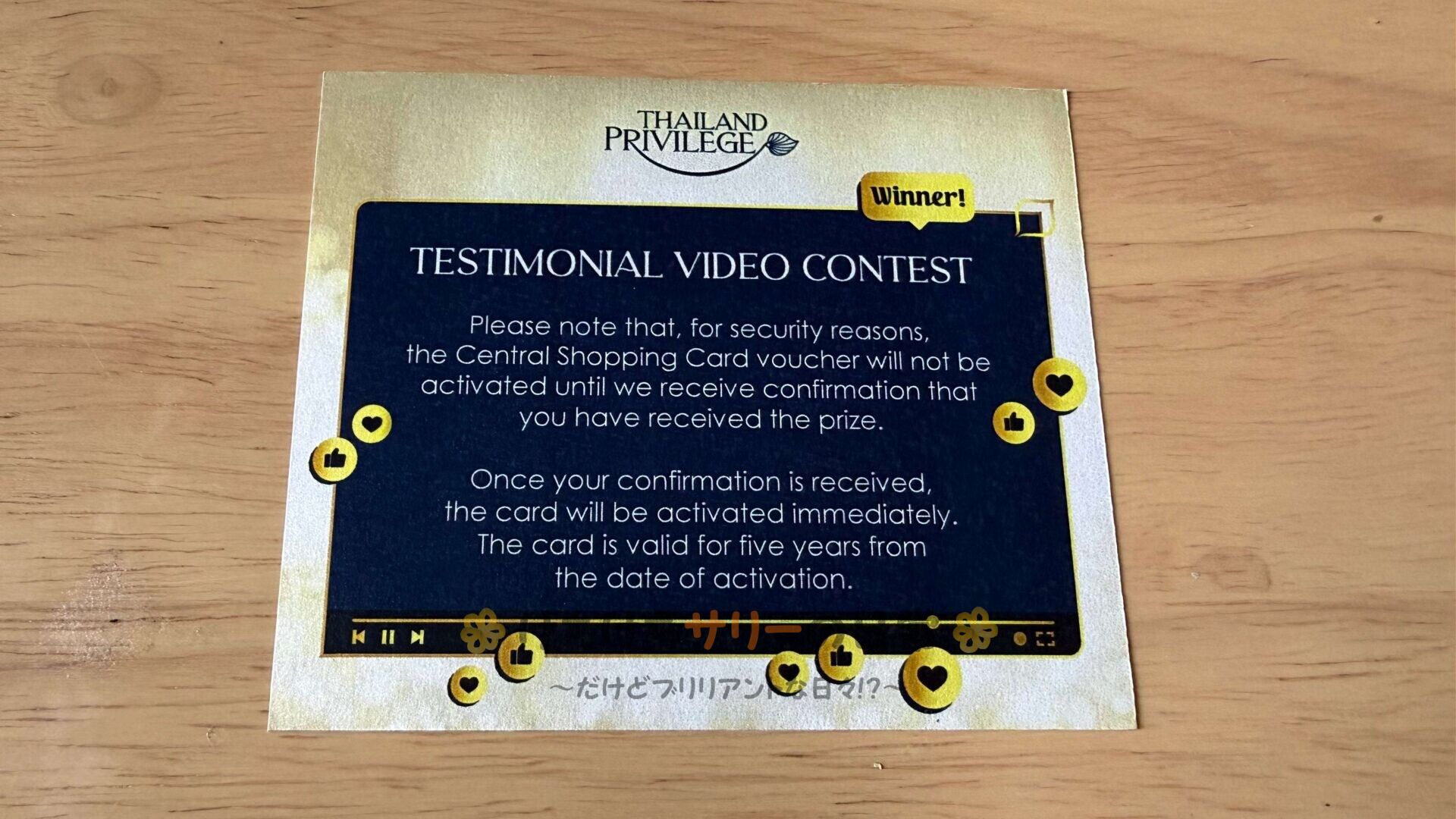 今日はThailand Privilege社が開催した体験動画コンテストに応募したら、見事3位入賞して1万バーツのショッピングカードをプレゼントしてもらったお話だったよ。