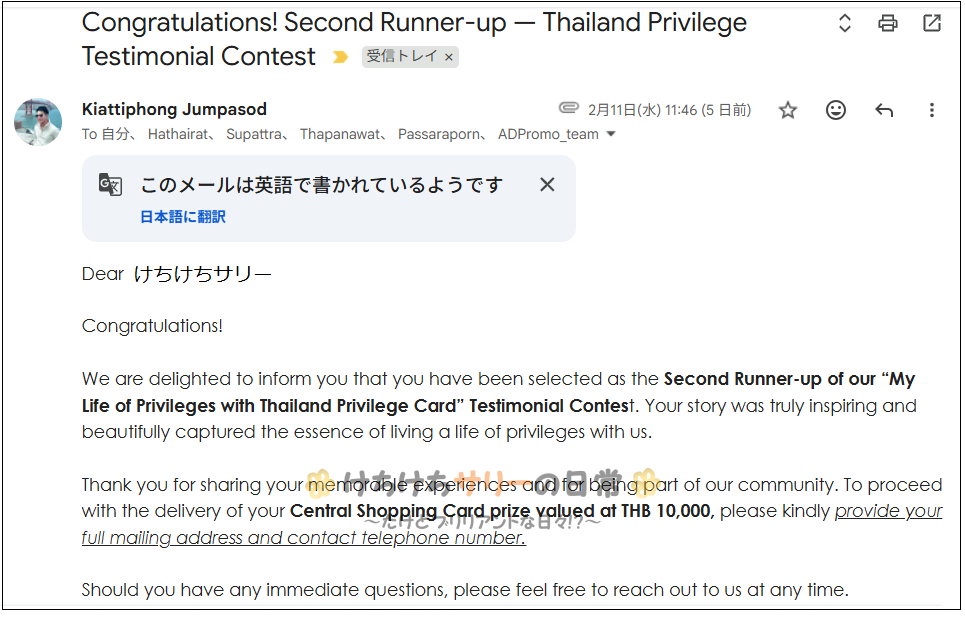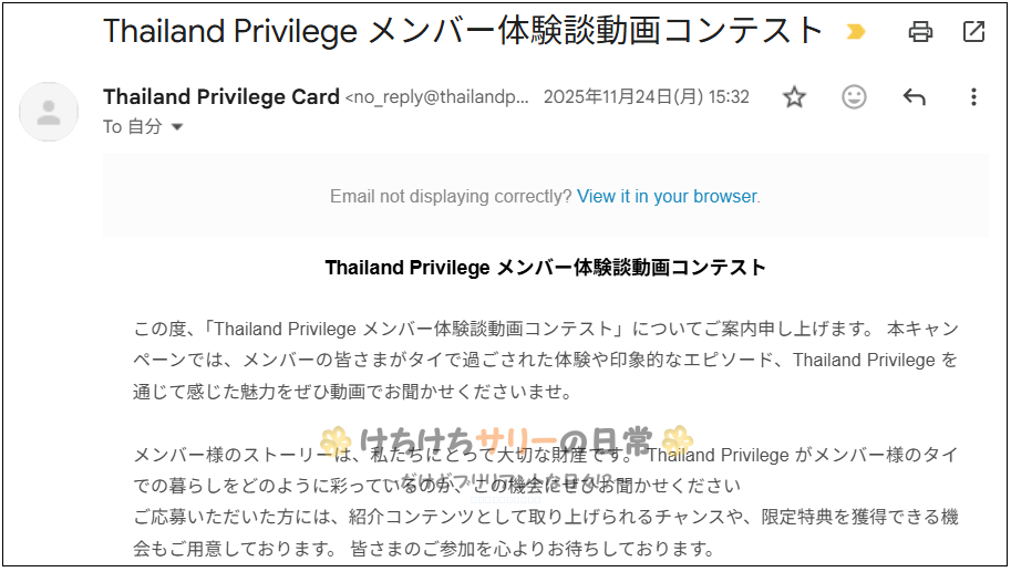 Thailand Privilegeから突然『動画コンテストの結果を素早く連絡するために、今タイにいるかどうか確認させて欲しい』というメールが届いたよ。