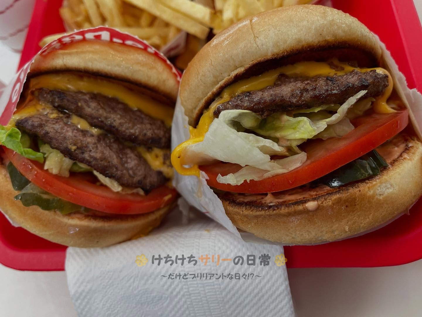 相方はパテが2枚のダブルダブル、サリーはチーズバーガーを頼んだよ!