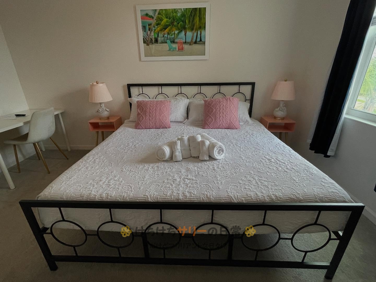 ベッドはキングベッドなので広々だし、作業机もあるので超快適👍