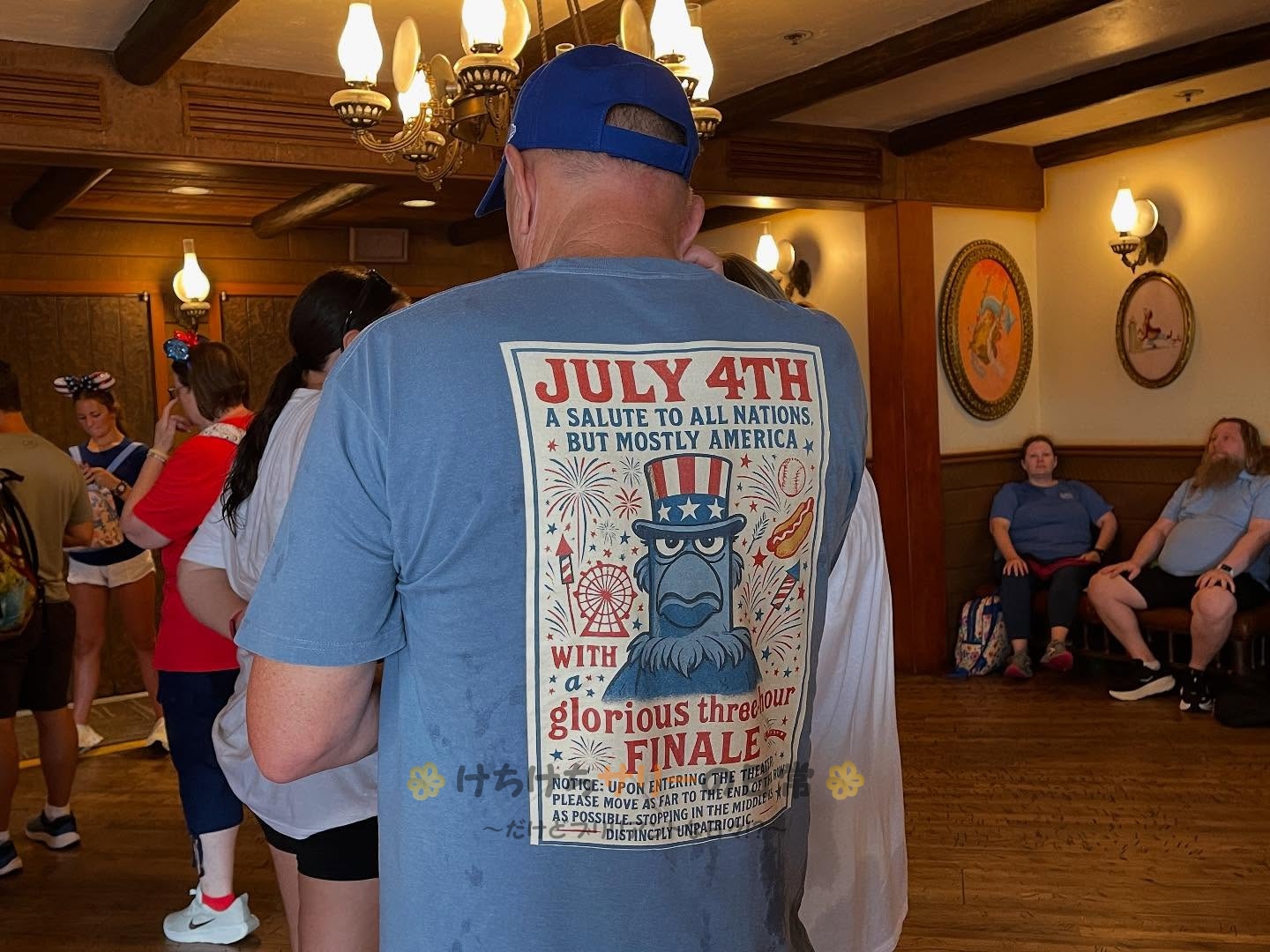 ディズニーに遊びに来ているアメリカ人はほぼ全員アメリカの国旗がついたTシャツを着てて、さらに1年でこの日しか着ることが出来ない”7月4日”と日付けが書いたTシャツを着た人もたくさん🇺🇸