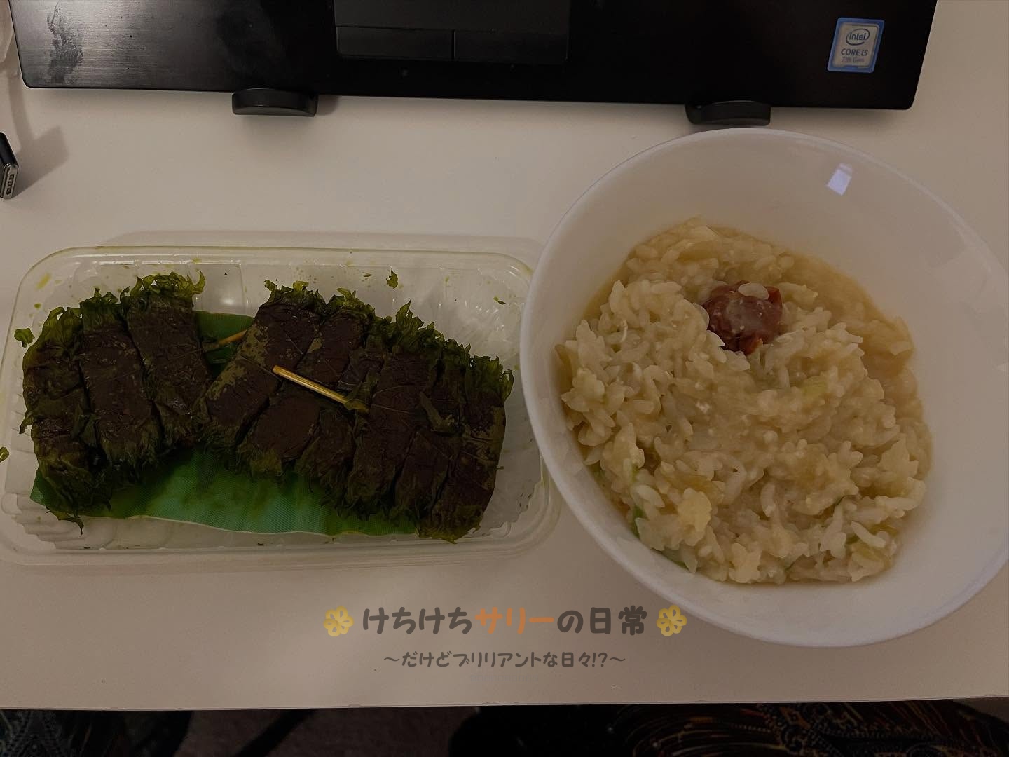 『ハンバーガーでも何でも食べられるよ』と相方が言ってるのは無視して、夜ご飯は卵雑炊を作る🥚 卵雑炊のお供は相方ママがこの旅の為に差し入れしてくれた味噌シソ巻き。サッパリしたシソと甘めの味噌が、雑炊のお供にピッタリ✨