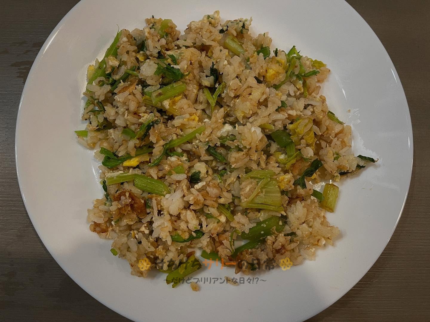 チキンのお供はサリー特製のセロリチャーハン。アメリカで1番コスパが良い野菜はセロリだと気がついて日々セロリをポリポリと食べてるんだけど、セロリの葉が余ってたからセロリの葉と卵を具に作ったら美味しくできた✨