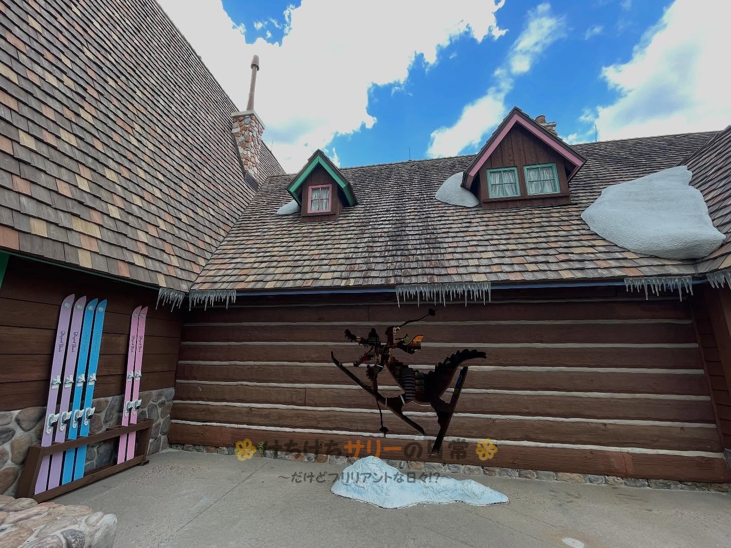 ダイニングの建物が雪で押しつぶされてたりとスキーリゾート感が満載の雰囲気❄️時々、雪(のように見える水しぶき)がどこそことなく降ってくる演出もある。