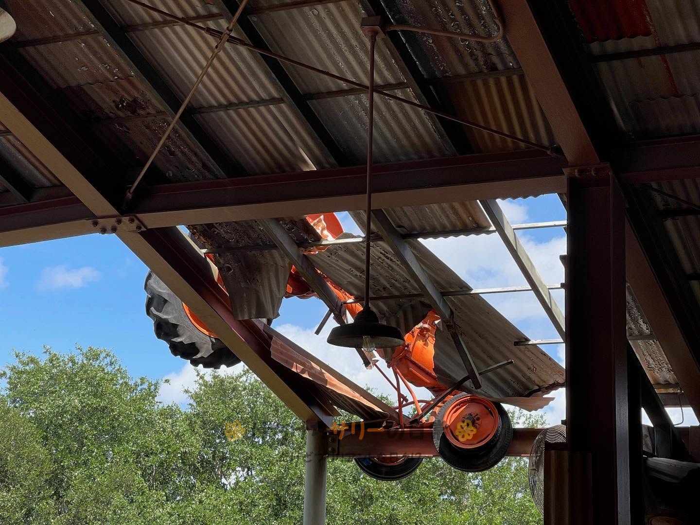 屋根の上に台風で飛ばされたトラクターが乗ってる‼️(このトタン屋根のサビ具合も本当にリアル)