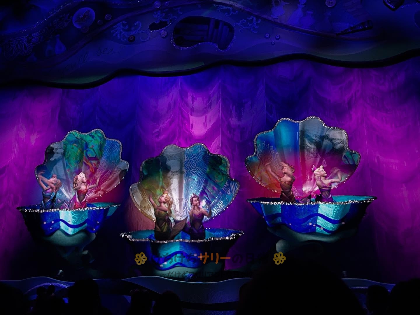 これはミュージカルショーでアリエルが実際に歌を歌いながら映画を30分構成にまとめた形で演じてくれる🧜 正直な所、サリーも相方も映画を見たことは無かったけど、このショーでどんなストーリーなのか理解できたよ👍 音楽も軽快だし途中でシャボン玉が降ってきたりと五感で楽しめる構成になってて見応えがあったよ😉